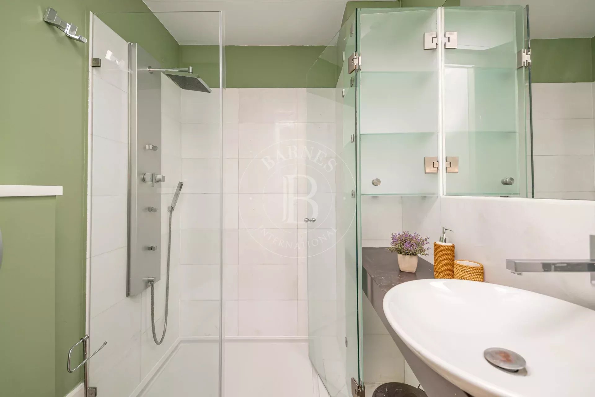 La chambre principale est un véritable havre de paix, avec de grandes fenêtres, des placards intégrés sur mesure et une salle de bains en suite habillée de marbre, avec double vasque et douche à effet pluie.