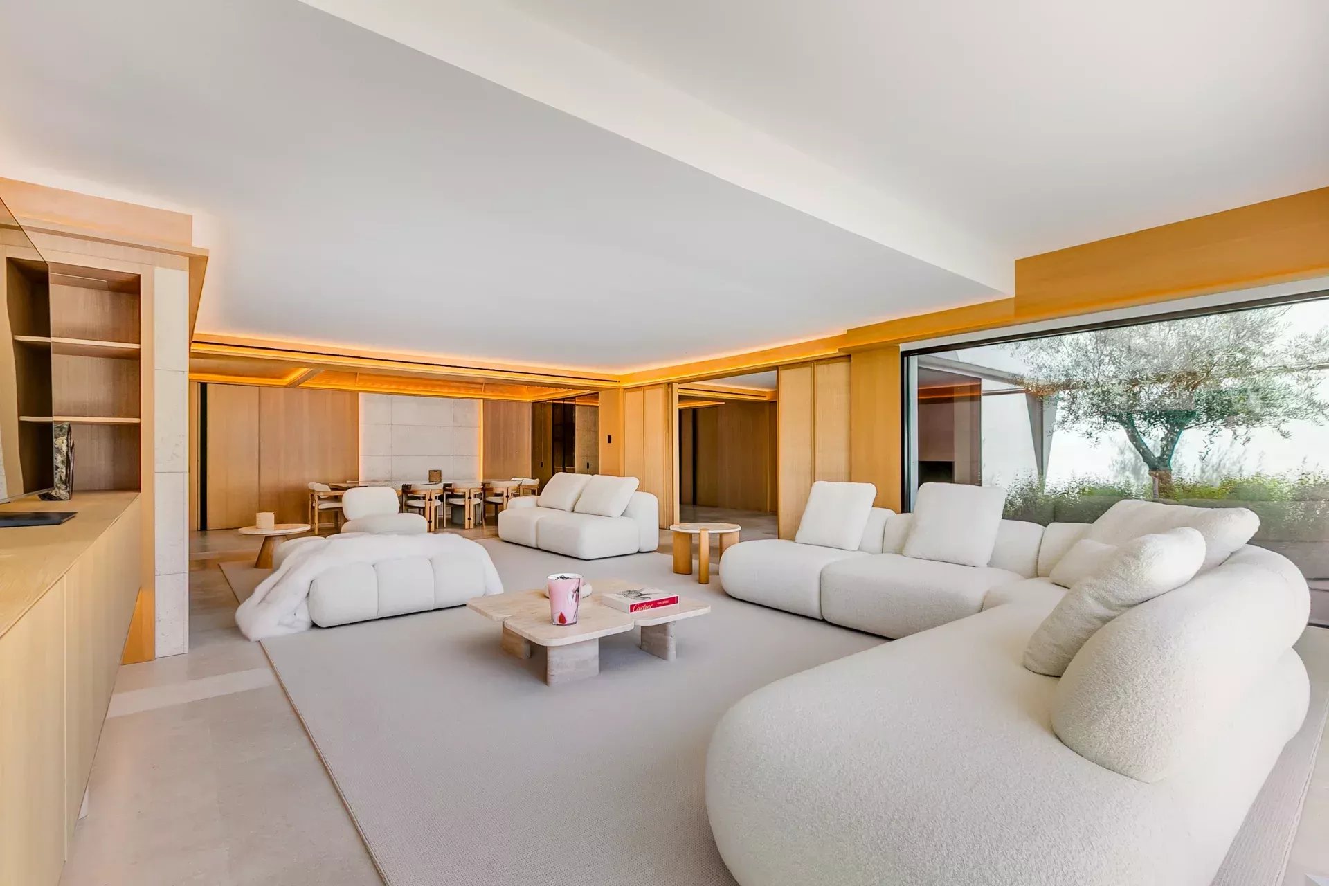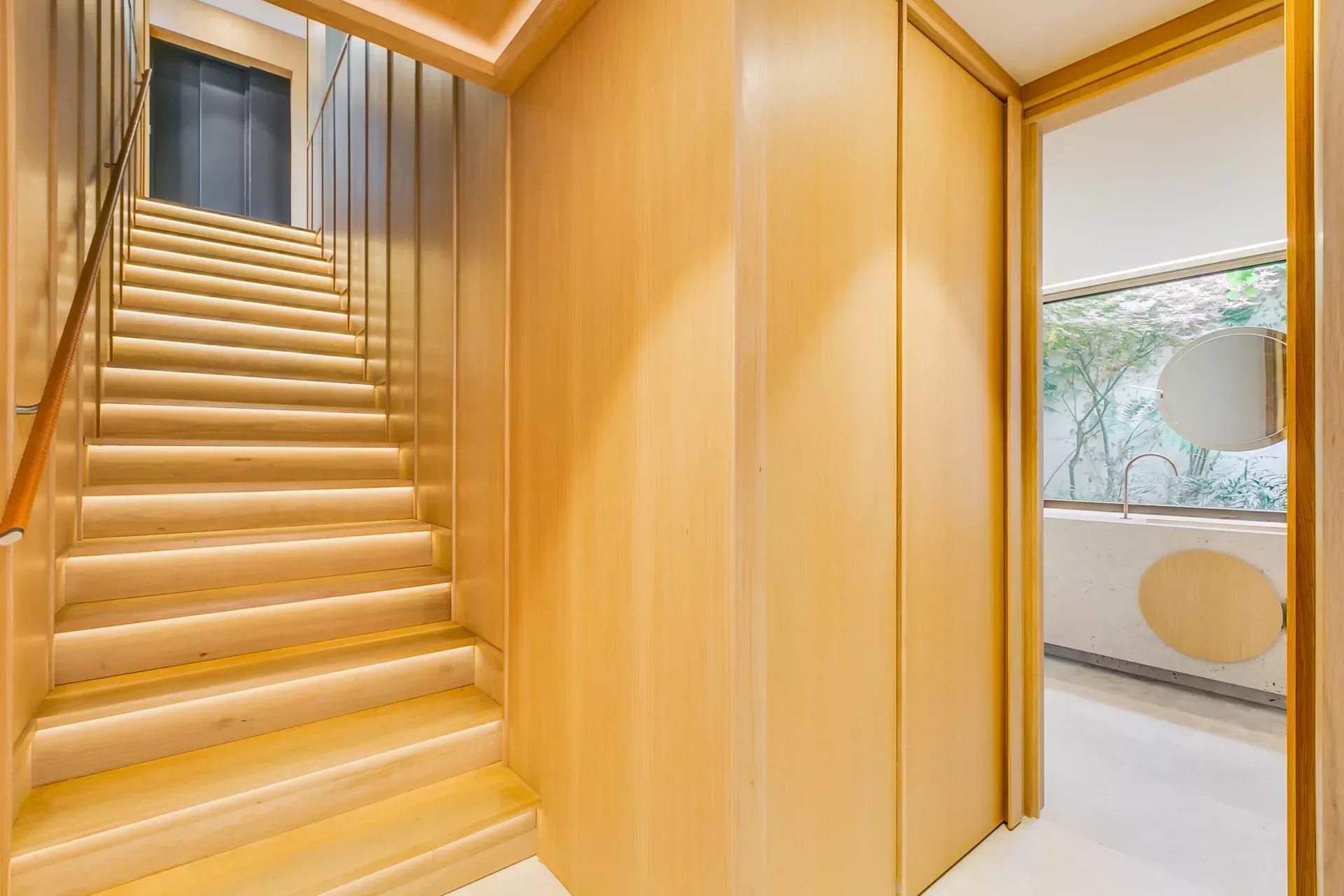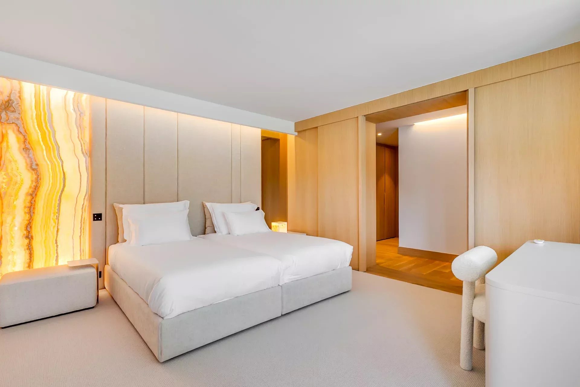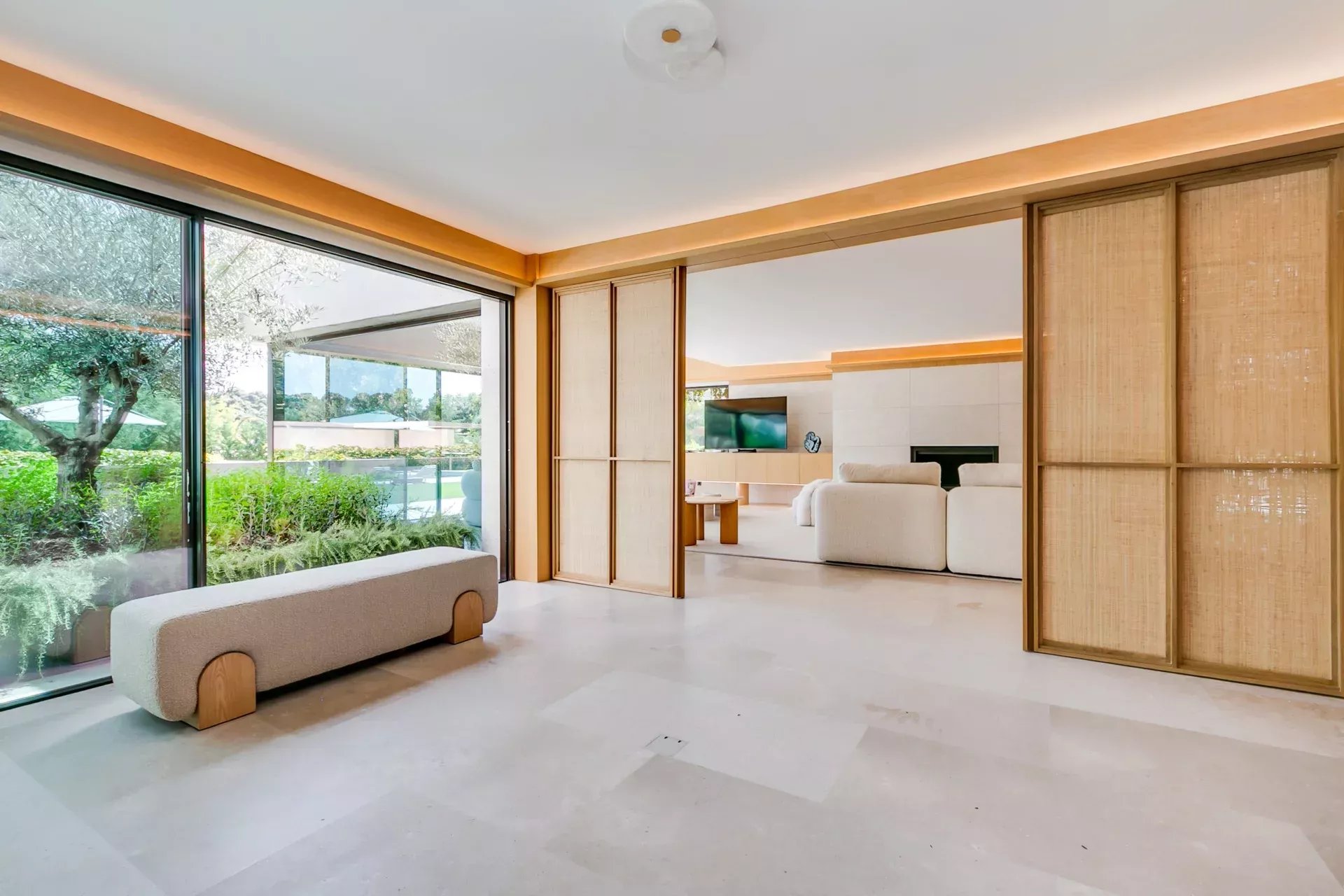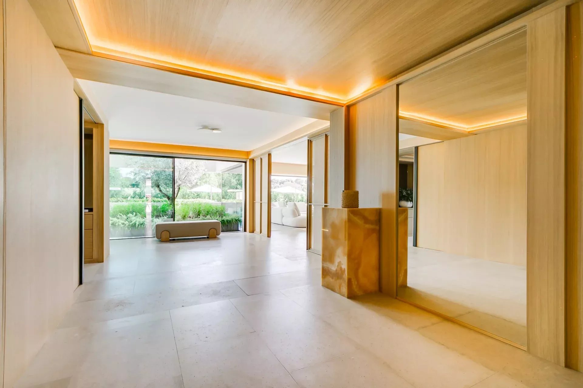 À l’intérieur, le design associe chaleur et sophistication : chêne naturel, calcaire, panneaux d’onyx rétroéclairés et palette de tons neutres. Des panneaux japonais modulables séparent l’entrée du salon tout en préservant une continuité visuelle ; l’éclairage indirect valorise chaque ligne architecturale.