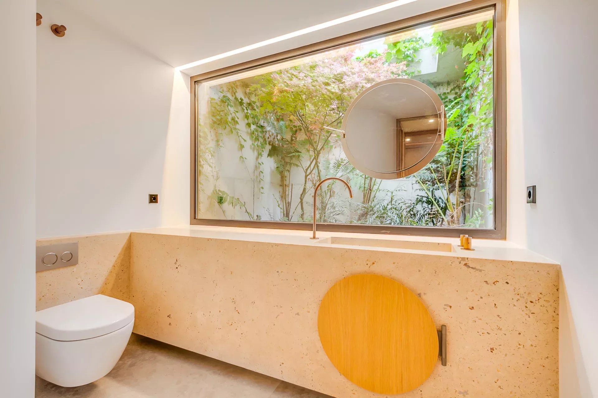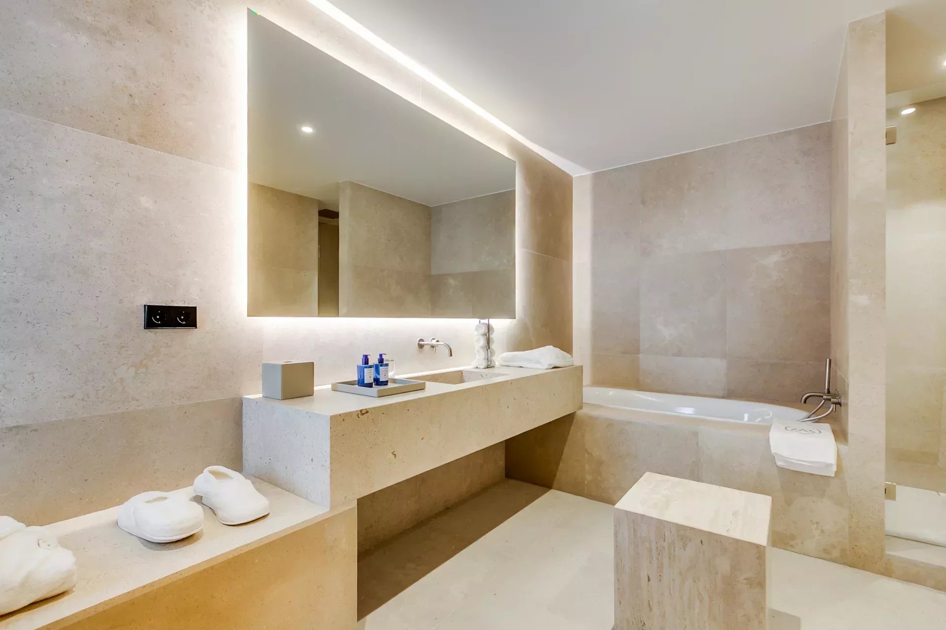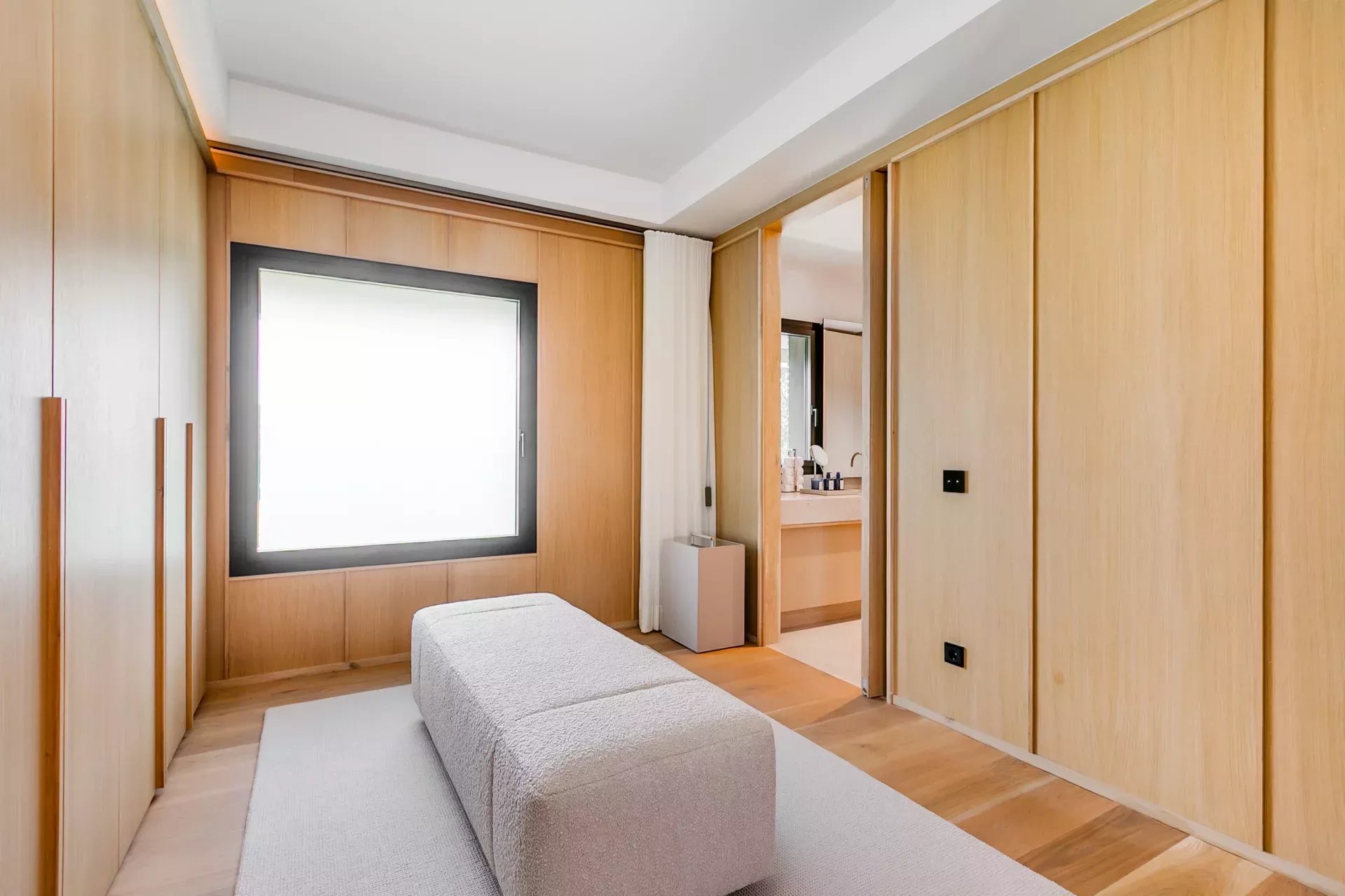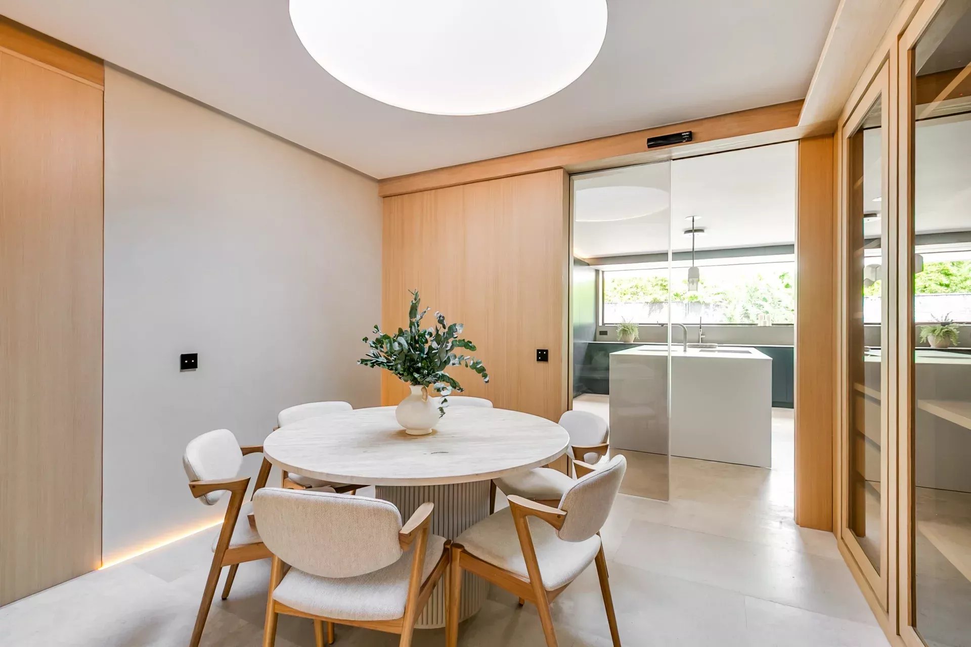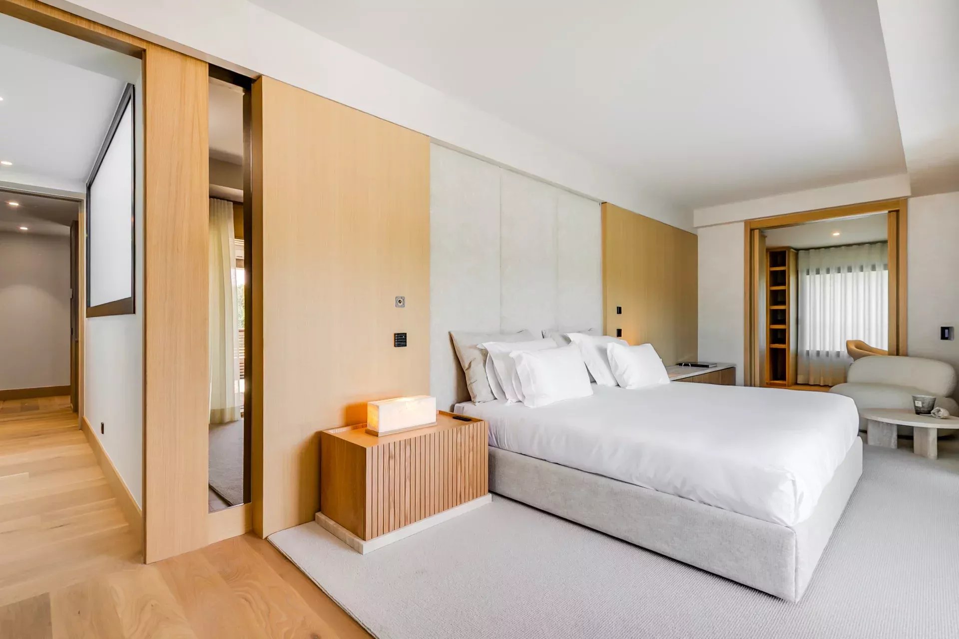 À l’intérieur, le design associe chaleur et sophistication : chêne naturel, calcaire, panneaux d’onyx rétroéclairés et palette de tons neutres. Des panneaux japonais modulables séparent l’entrée du salon tout en préservant une continuité visuelle ; l’éclairage indirect valorise chaque ligne architecturale.