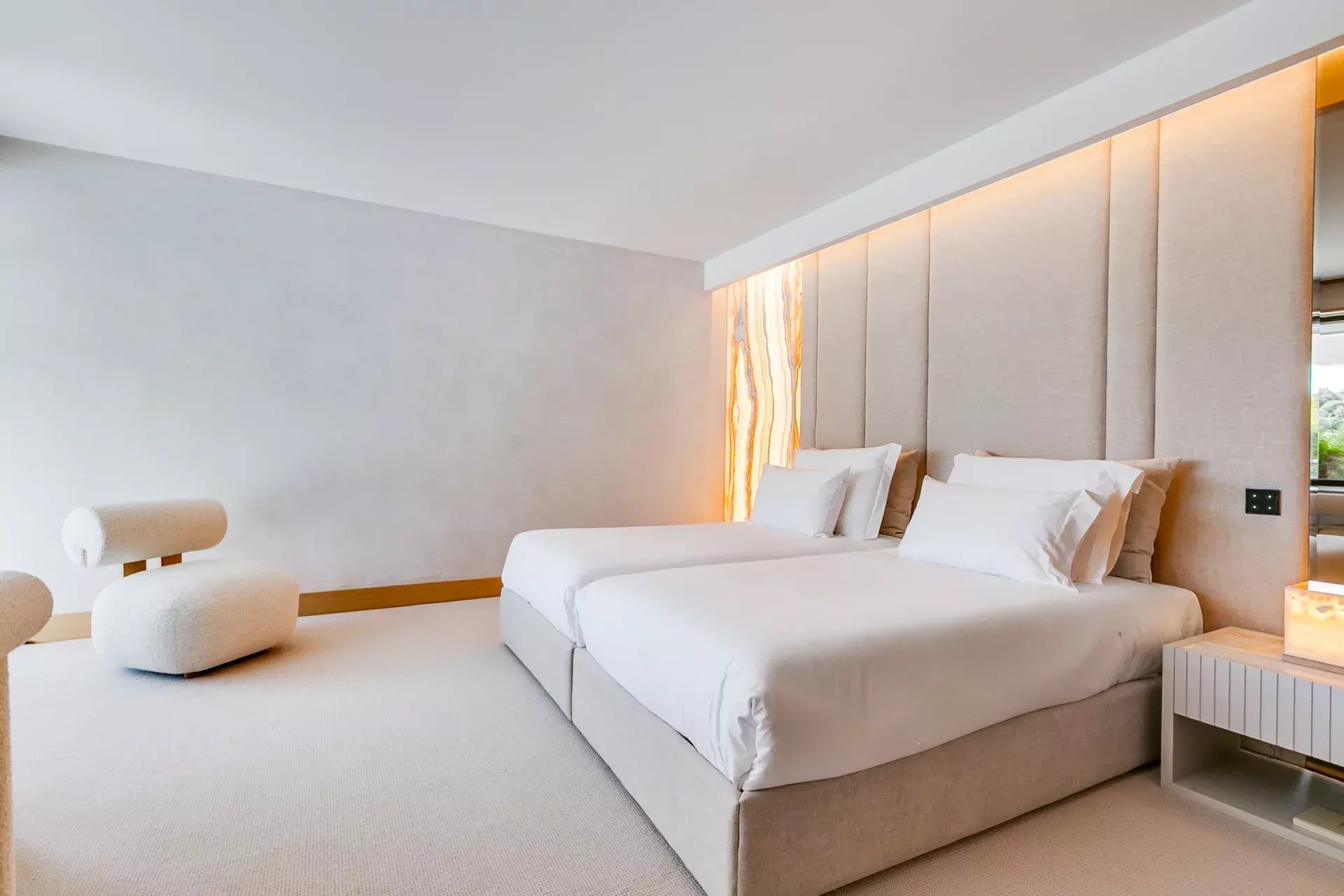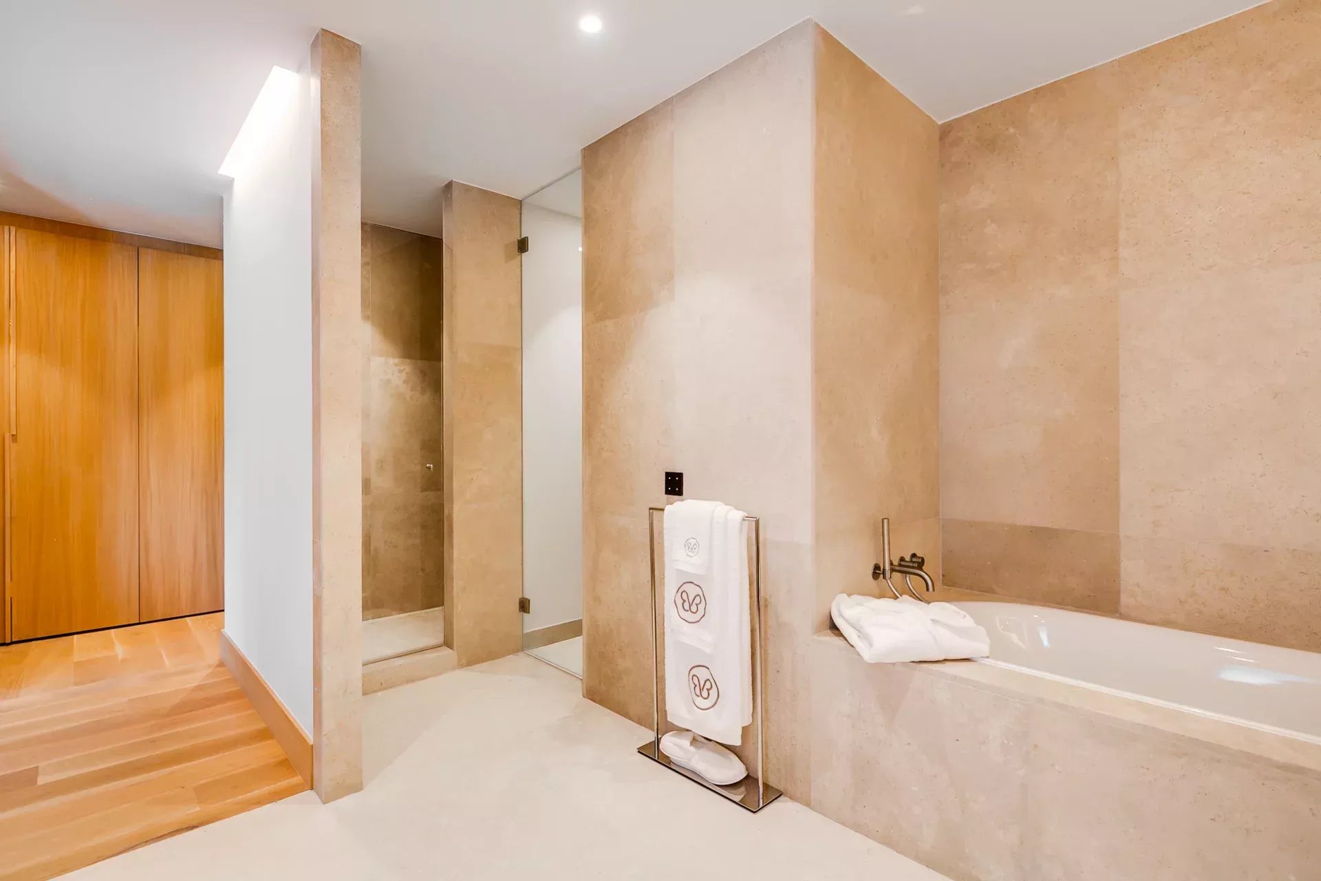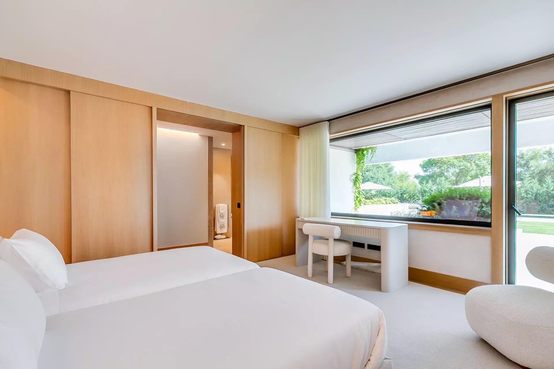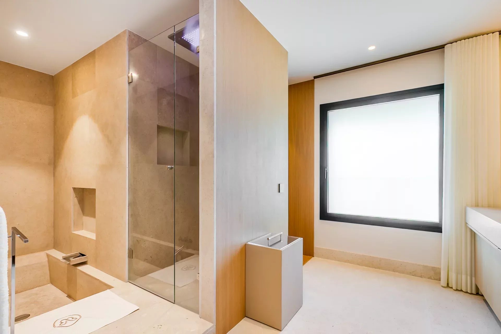 À l’intérieur, le design associe chaleur et sophistication : chêne naturel, calcaire, panneaux d’onyx rétroéclairés et palette de tons neutres. Des panneaux japonais modulables séparent l’entrée du salon tout en préservant une continuité visuelle ; l’éclairage indirect valorise chaque ligne architecturale.