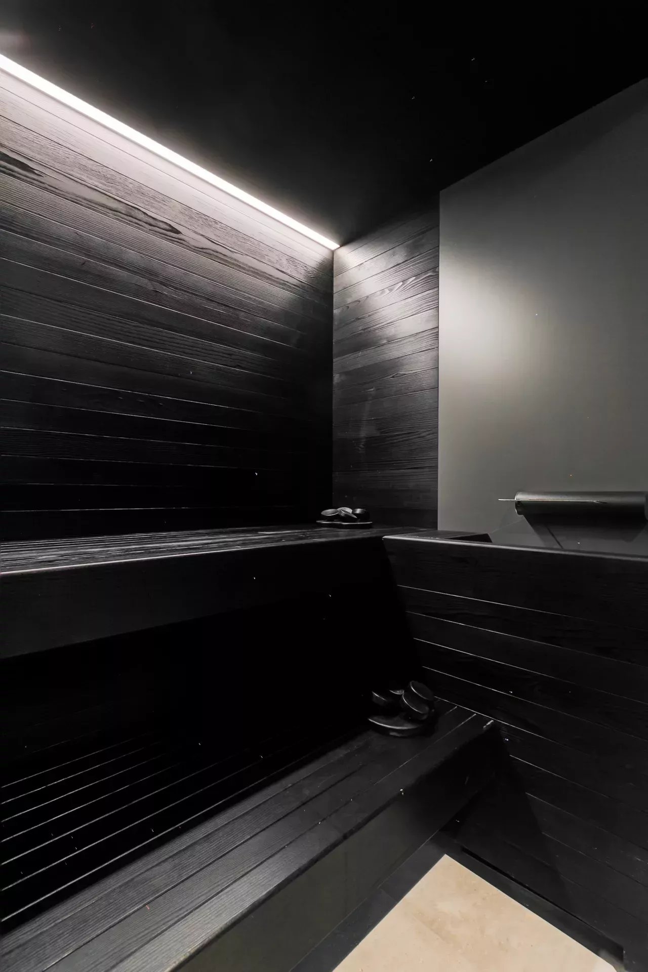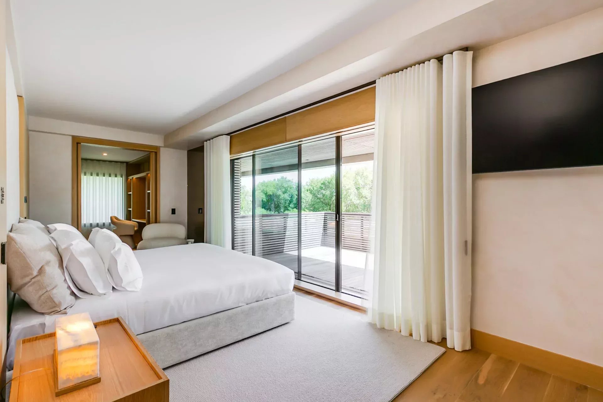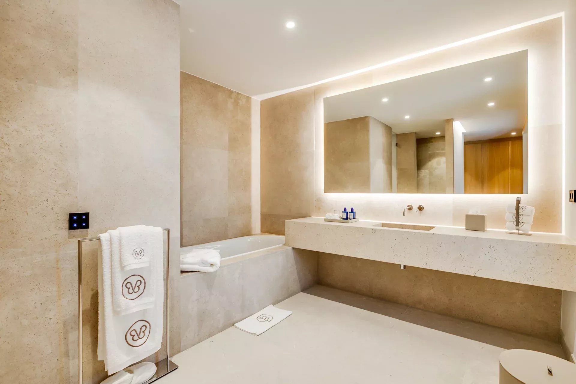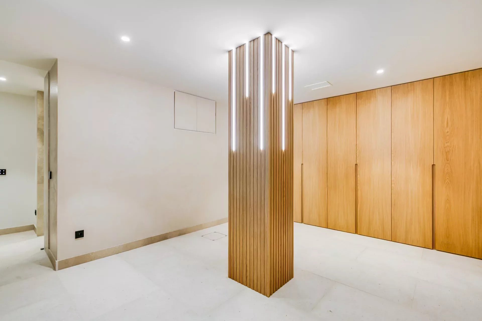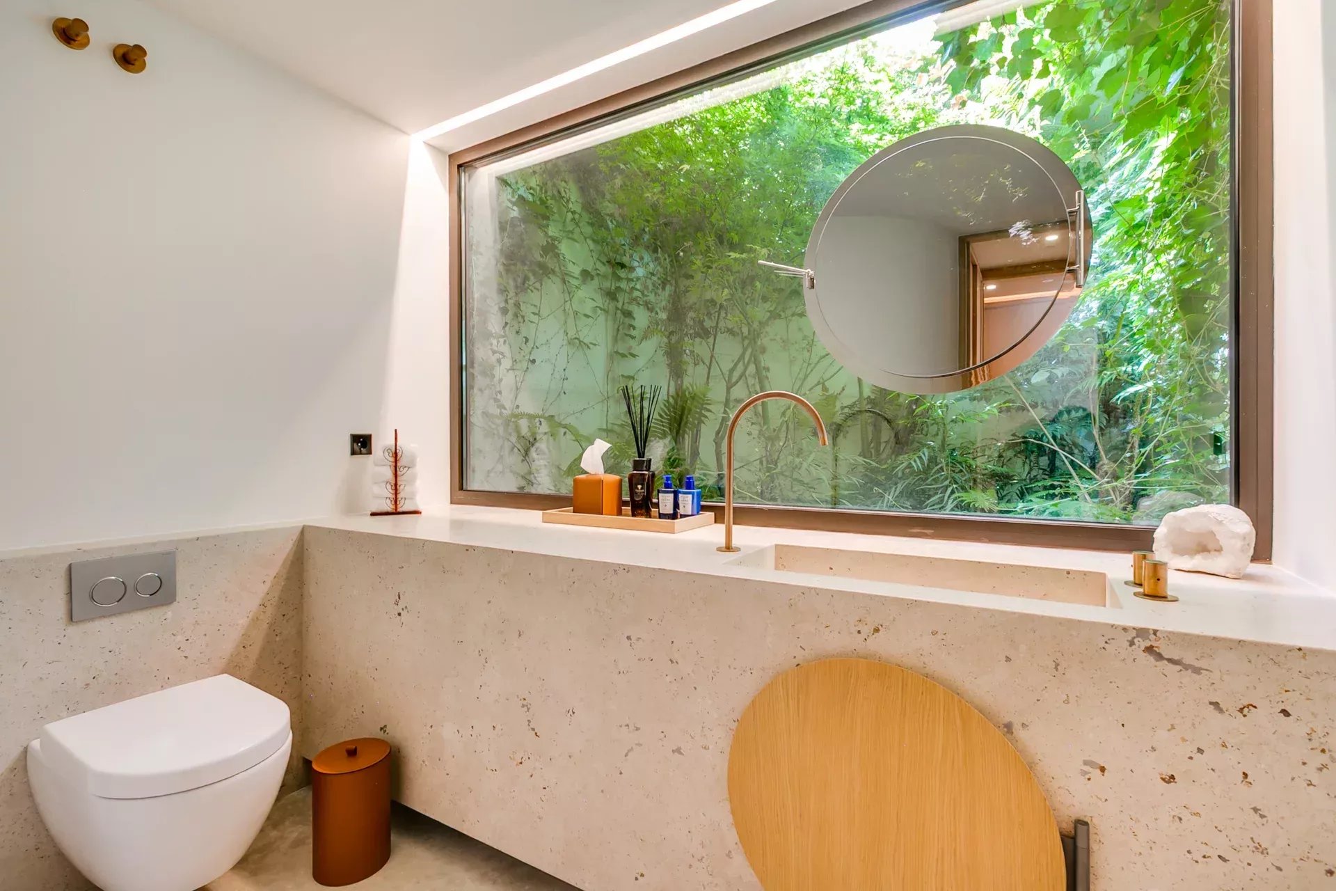 À l’intérieur, le design associe chaleur et sophistication : chêne naturel, calcaire, panneaux d’onyx rétroéclairés et palette de tons neutres. Des panneaux japonais modulables séparent l’entrée du salon tout en préservant une continuité visuelle ; l’éclairage indirect valorise chaque ligne architecturale.