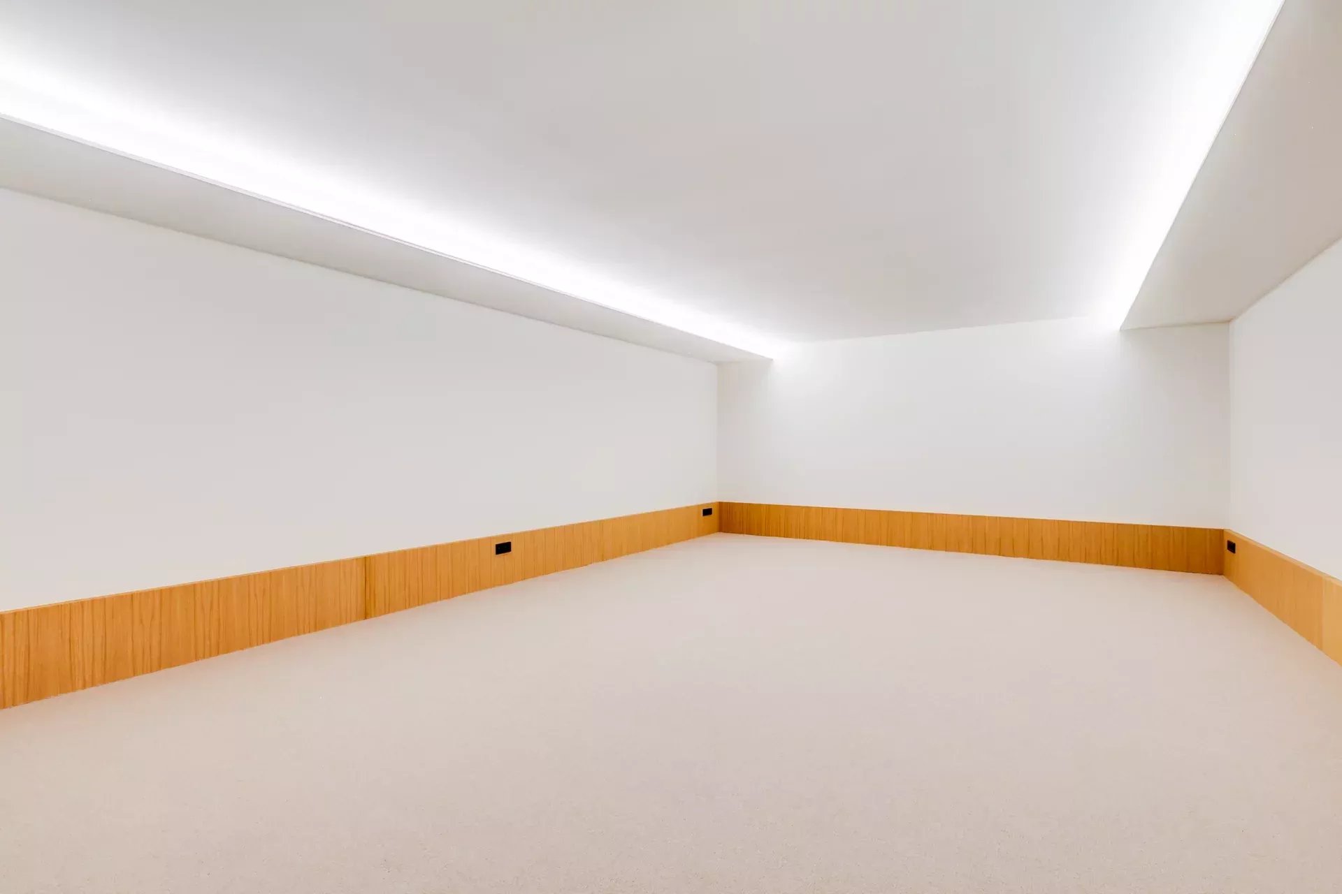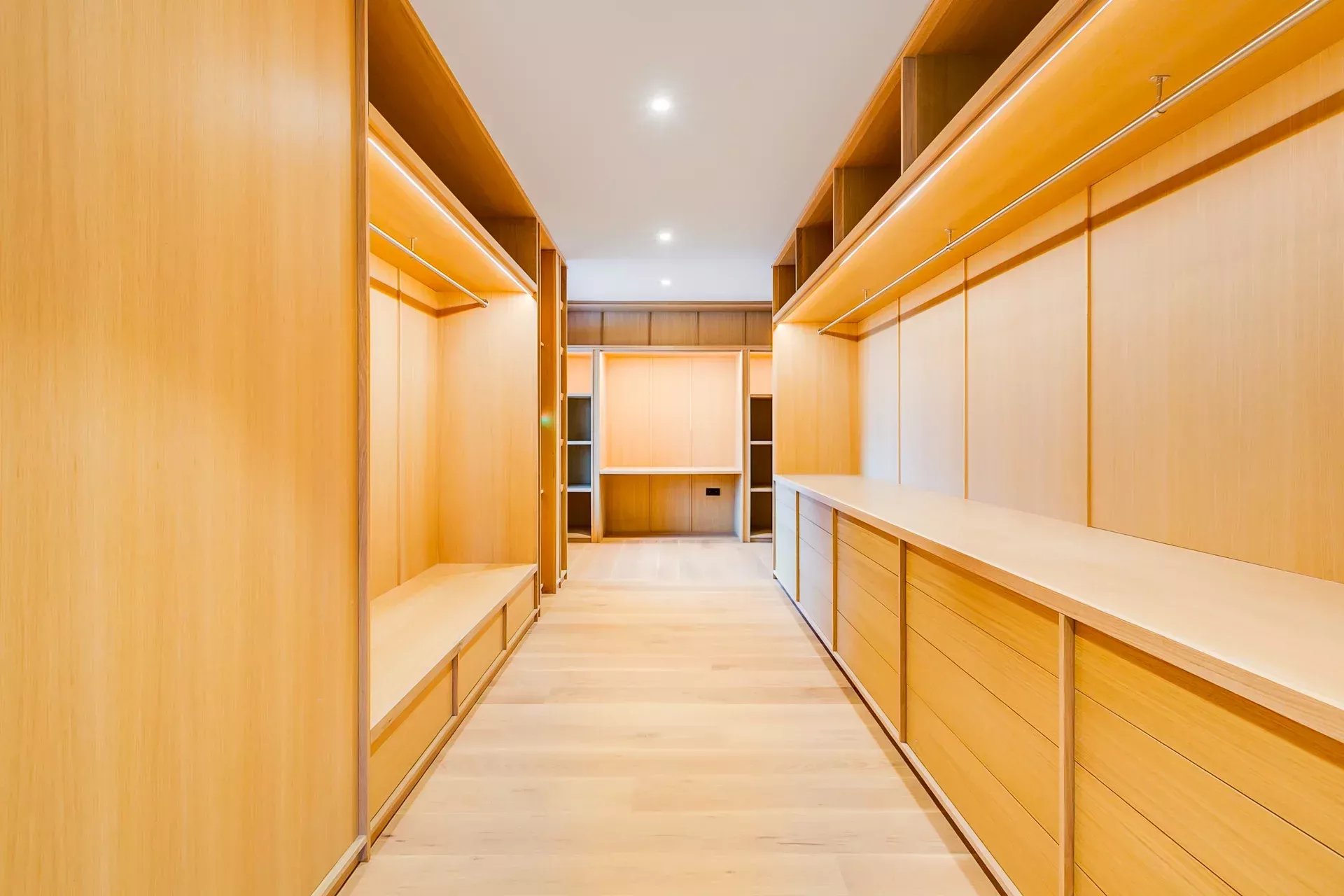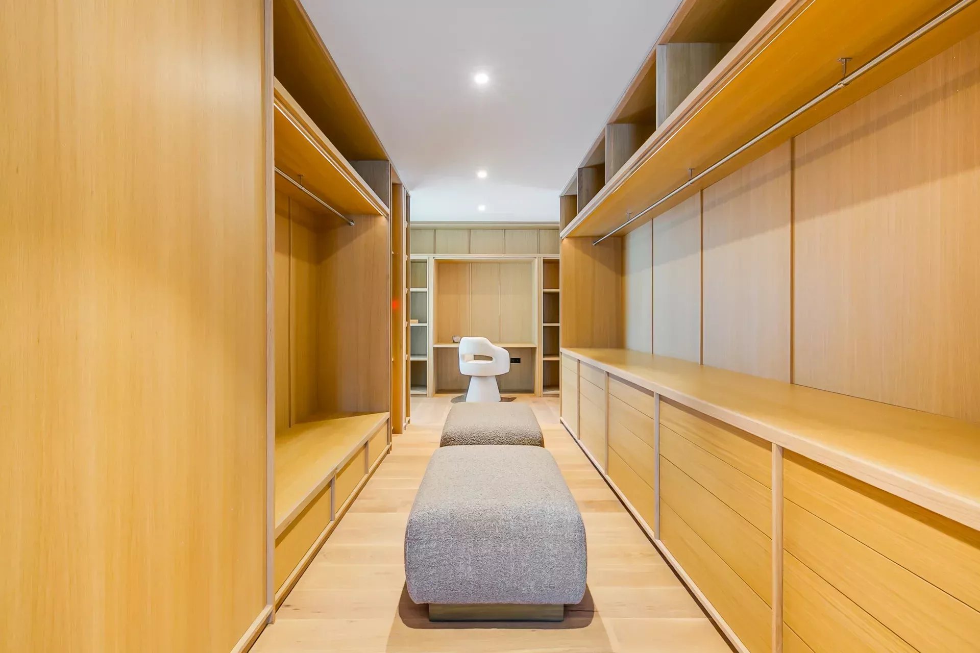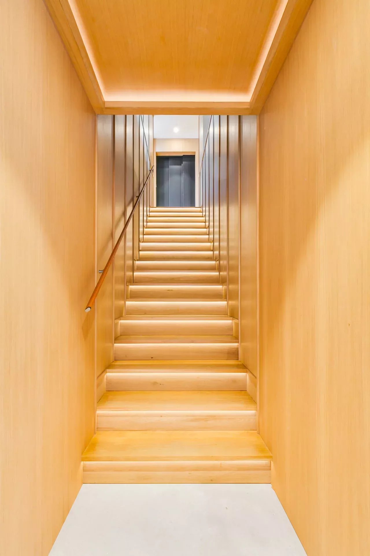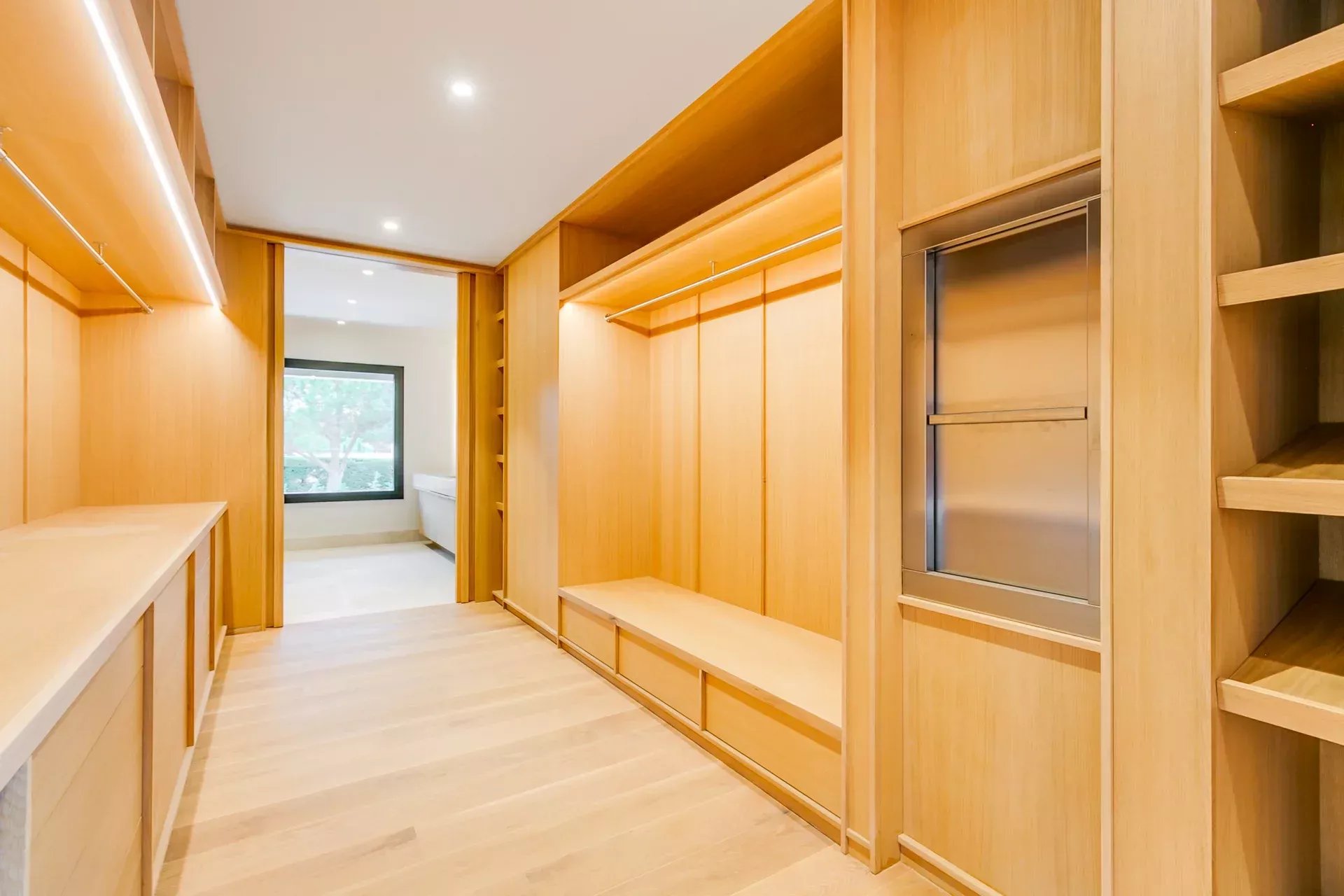 À l’intérieur, le design associe chaleur et sophistication : chêne naturel, calcaire, panneaux d’onyx rétroéclairés et palette de tons neutres. Des panneaux japonais modulables séparent l’entrée du salon tout en préservant une continuité visuelle ; l’éclairage indirect valorise chaque ligne architecturale.