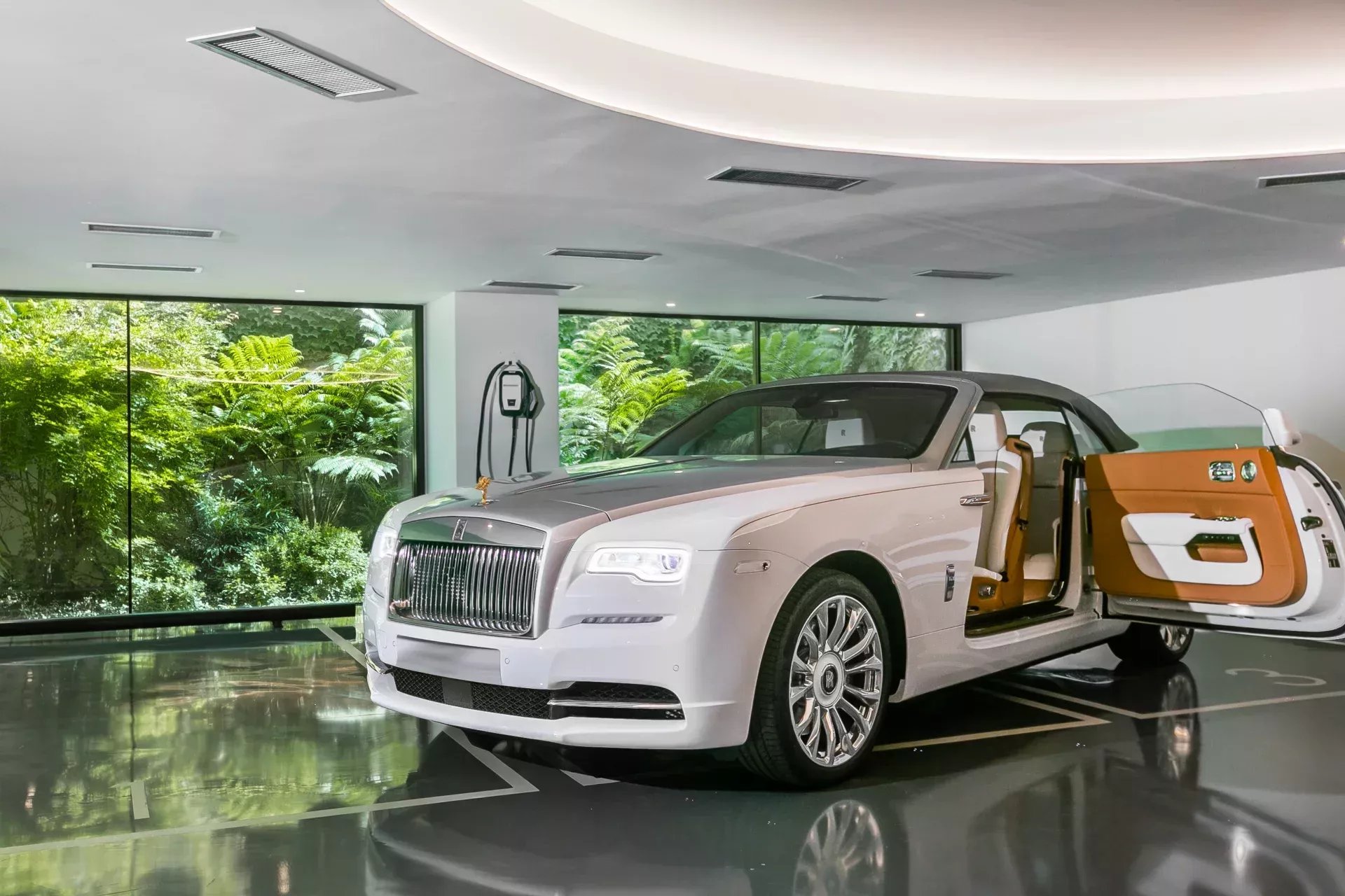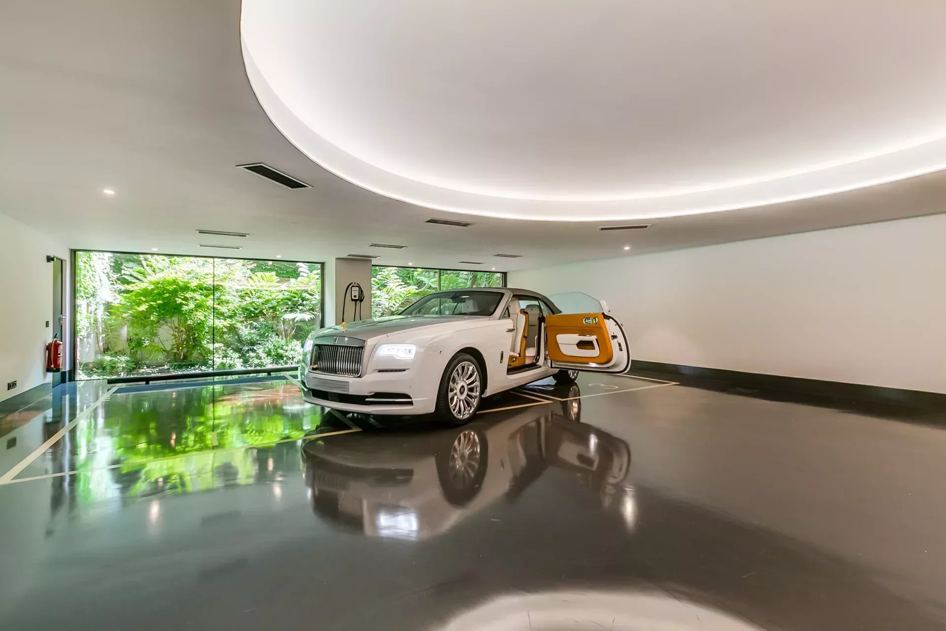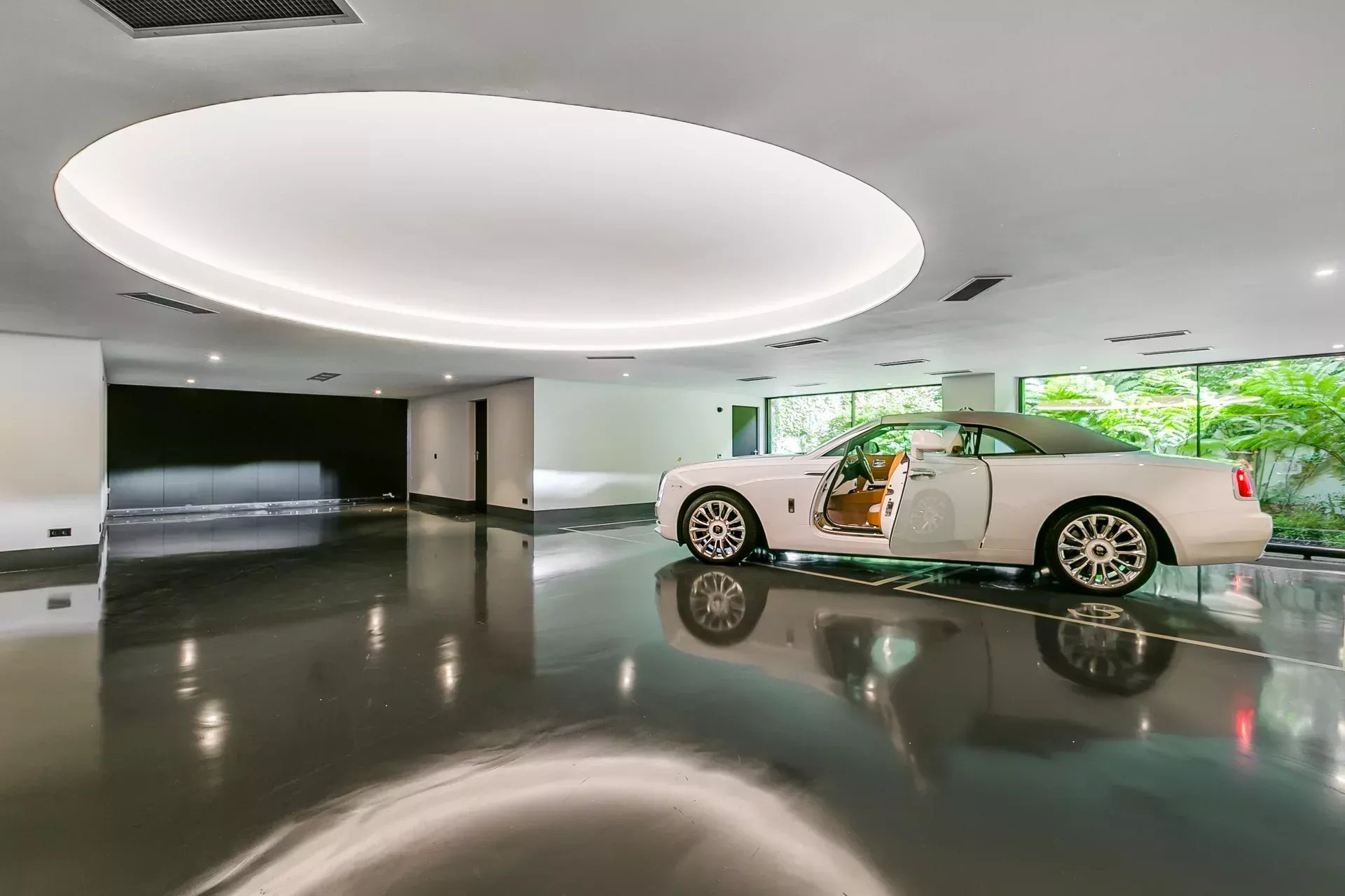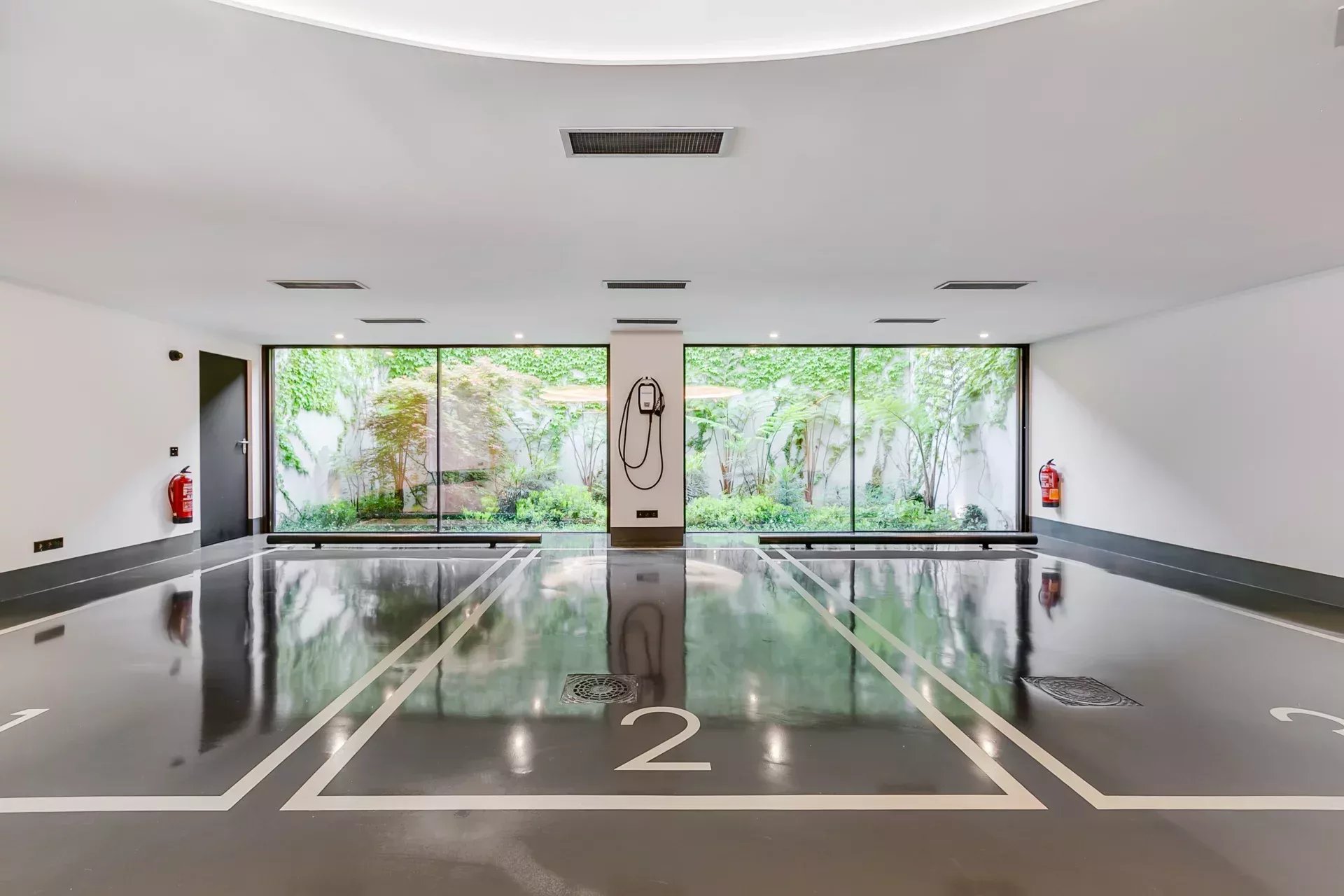 Ce niveau comprend également un garage galerie de six places, éclairage scénographique, bornes de recharge électrique et jardin intérieur visible par des vitrages.