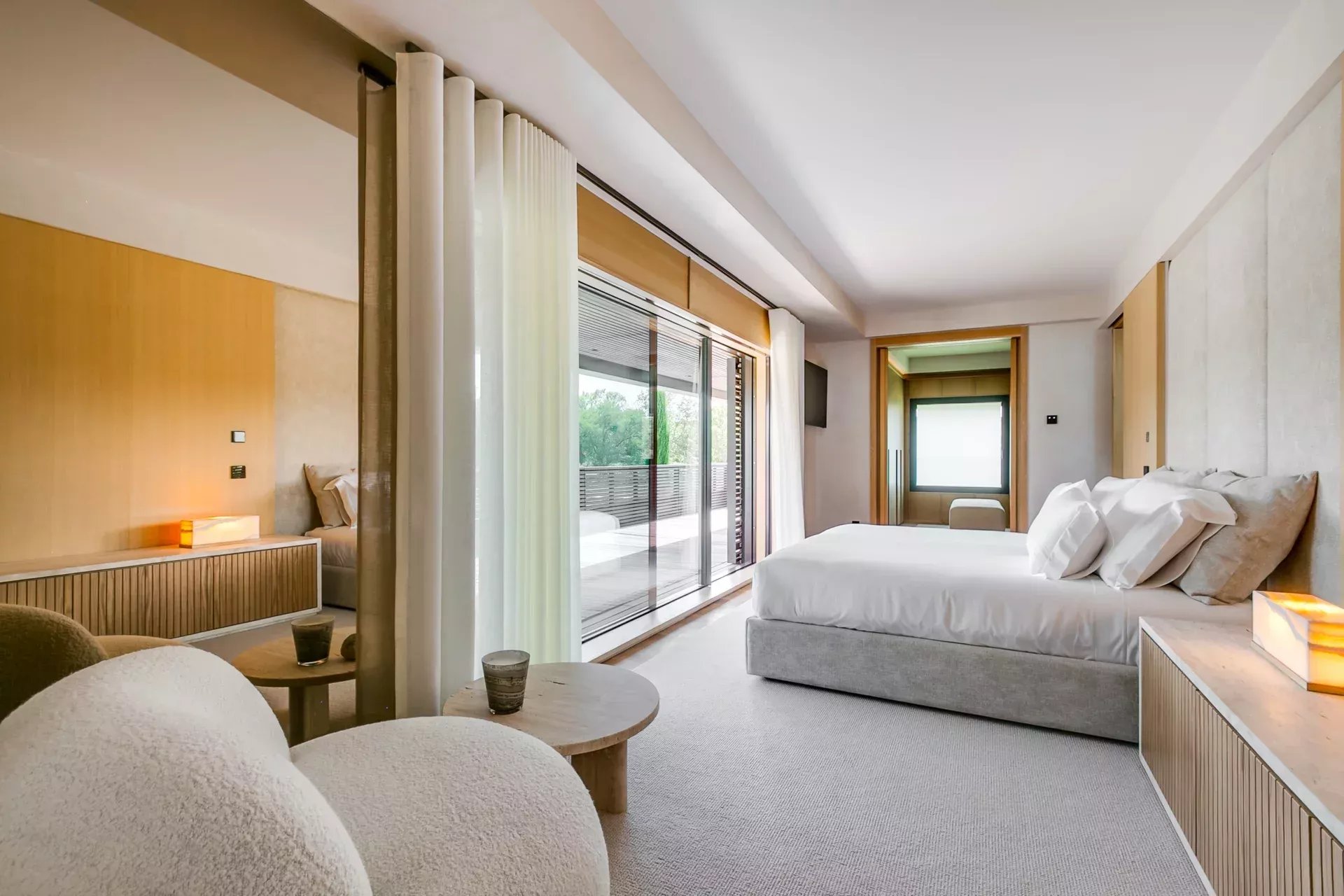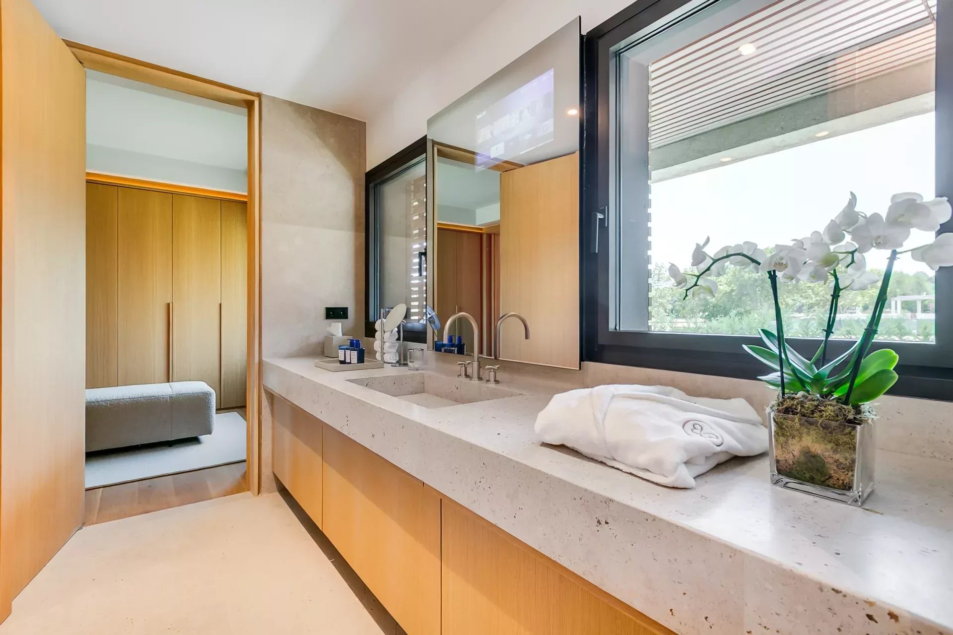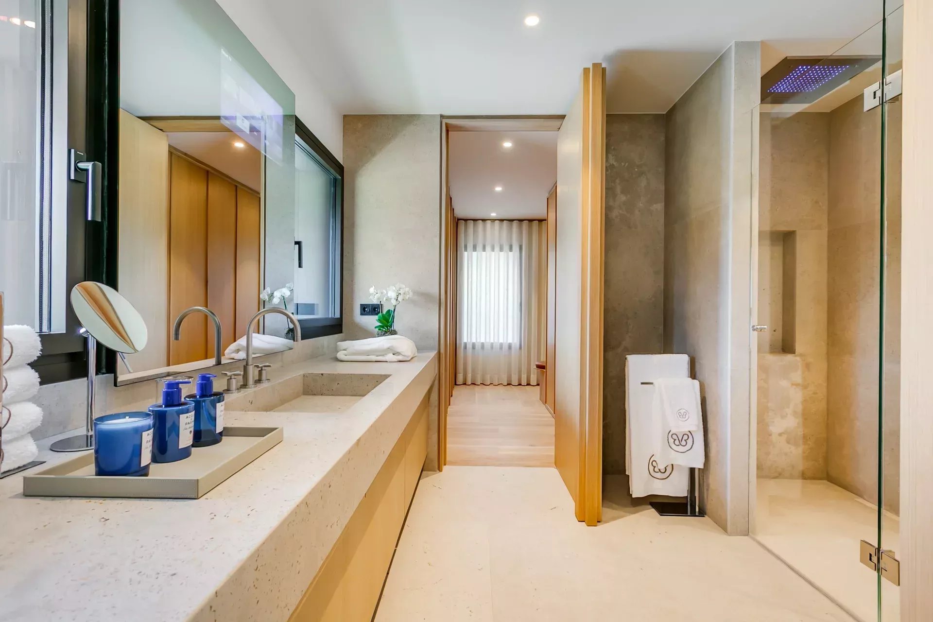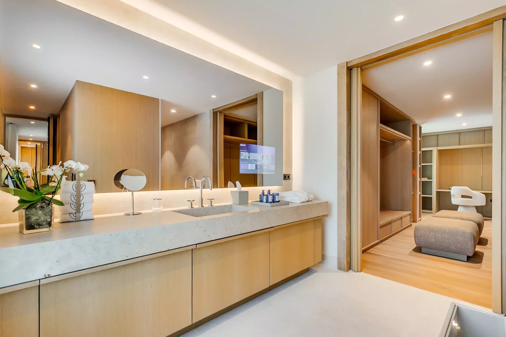 L’étage supérieur est entièrement dédié à la suite principale, avec deux dressings indépendants, des coiffeuses miroirs avec TV connectées, des placards intégrés et l’accès à une terrasse en deck offrant des vues privilégiées. La salle d’eau de la femme comprend une baignoire en marbre avec cascade d’eau et une douche pluie à chromothérapie ; la salle d’eau de l’homme bénéficie d’une douche similaire, le tout dans une ambiance spa.