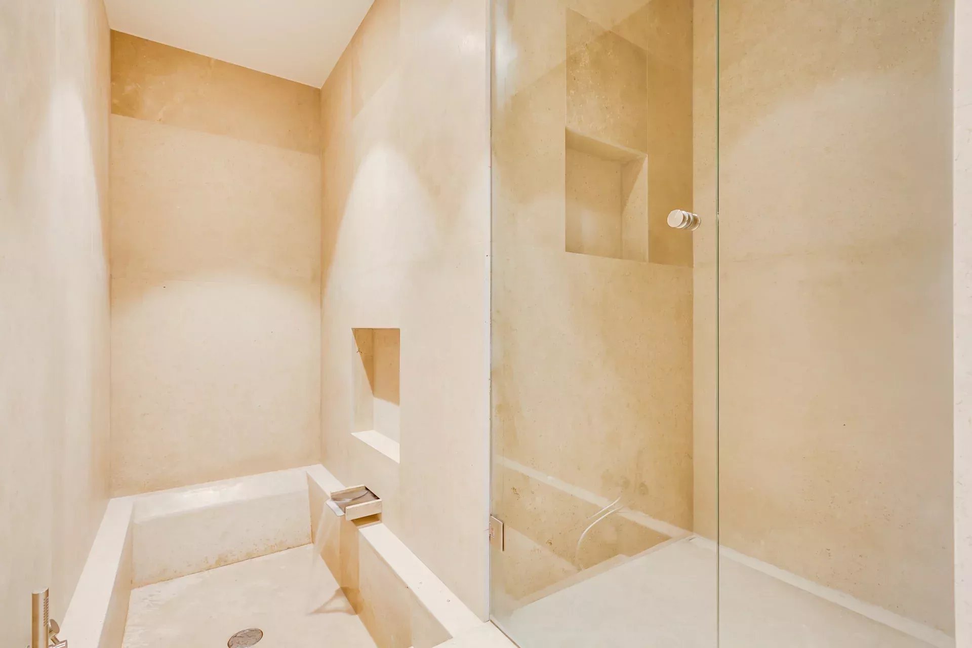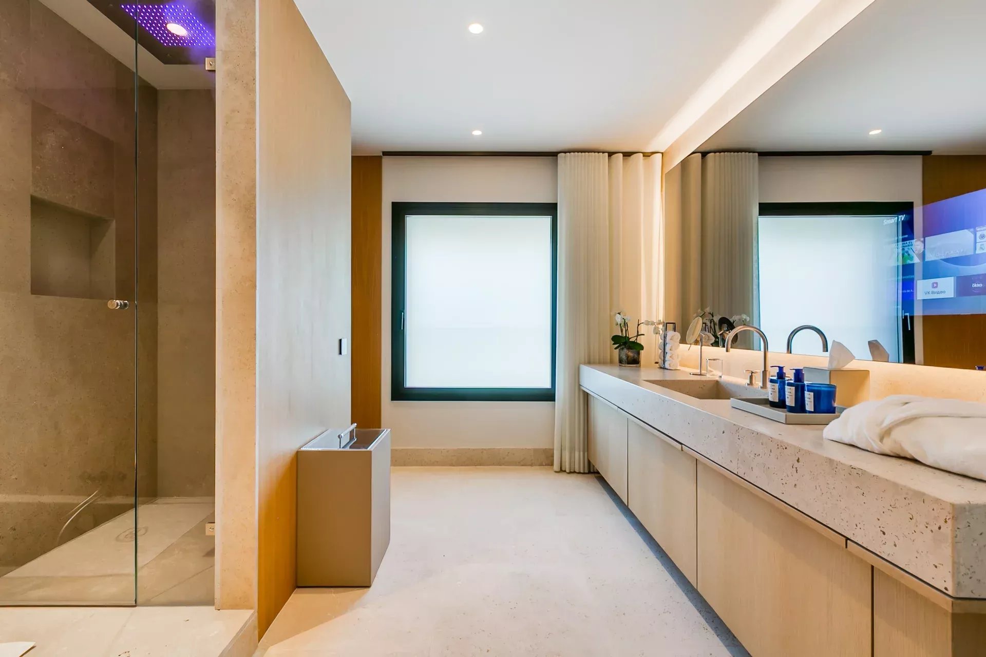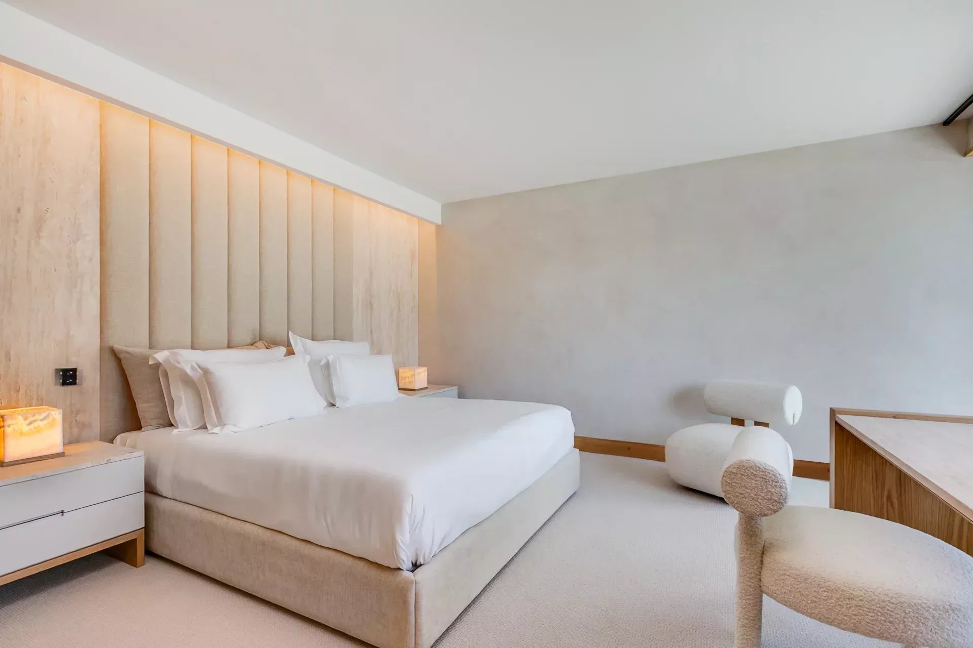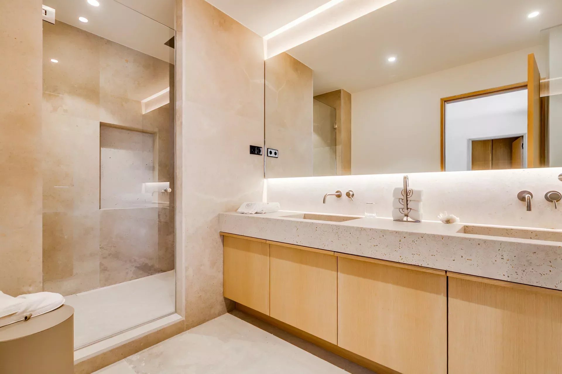L’étage supérieur est entièrement dédié à la suite principale, avec deux dressings indépendants, des coiffeuses miroirs avec TV connectées, des placards intégrés et l’accès à une terrasse en deck offrant des vues privilégiées. La salle d’eau de la femme comprend une baignoire en marbre avec cascade d’eau et une douche pluie à chromothérapie ; la salle d’eau de l’homme bénéficie d’une douche similaire, le tout dans une ambiance spa.