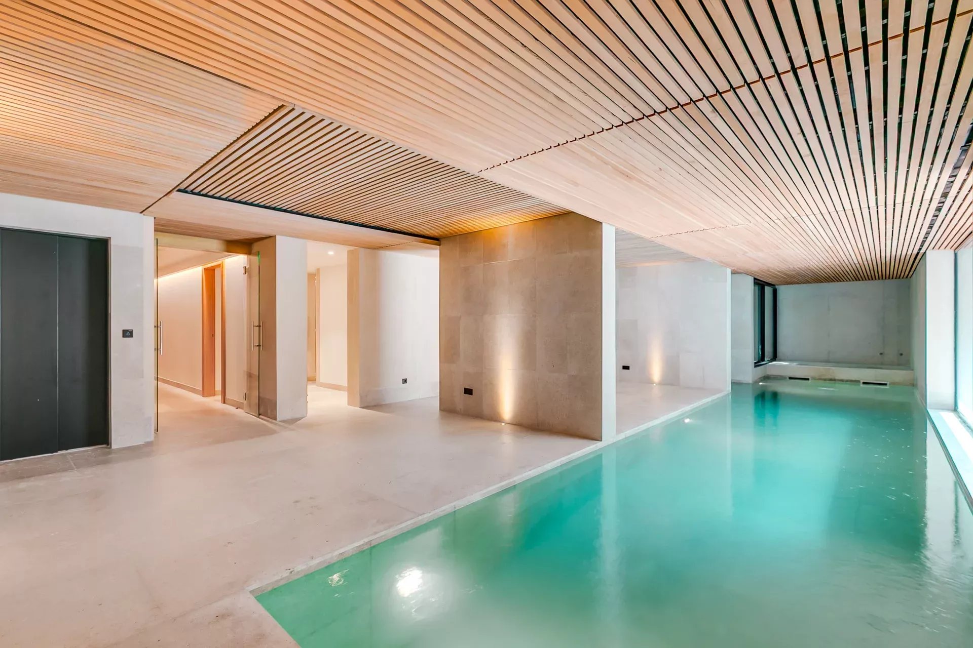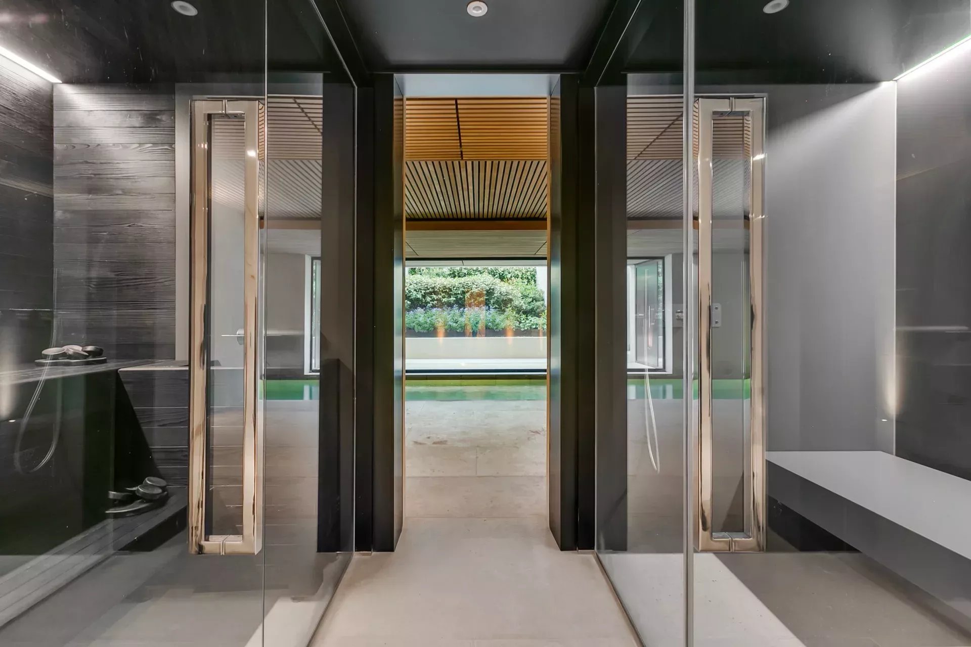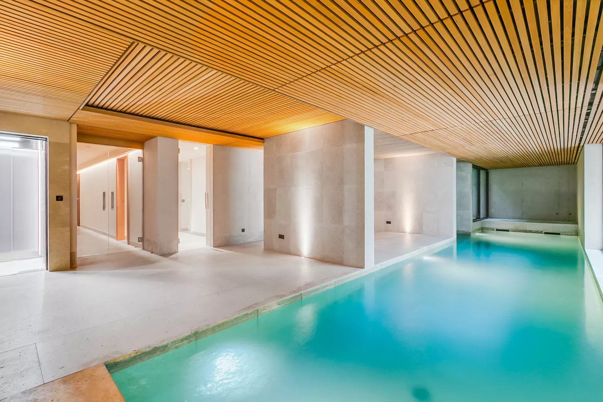 Le rez‑inférieur, avec accès direct au jardin et lumière naturelle grâce au dénivelé, abrite une impressionnante partie bien‑être comprenant piscine intérieure chauffée, sauna sec et humide, vestiaires, salles de bain et une salle polyvalente pour gym, yoga ou méditation.