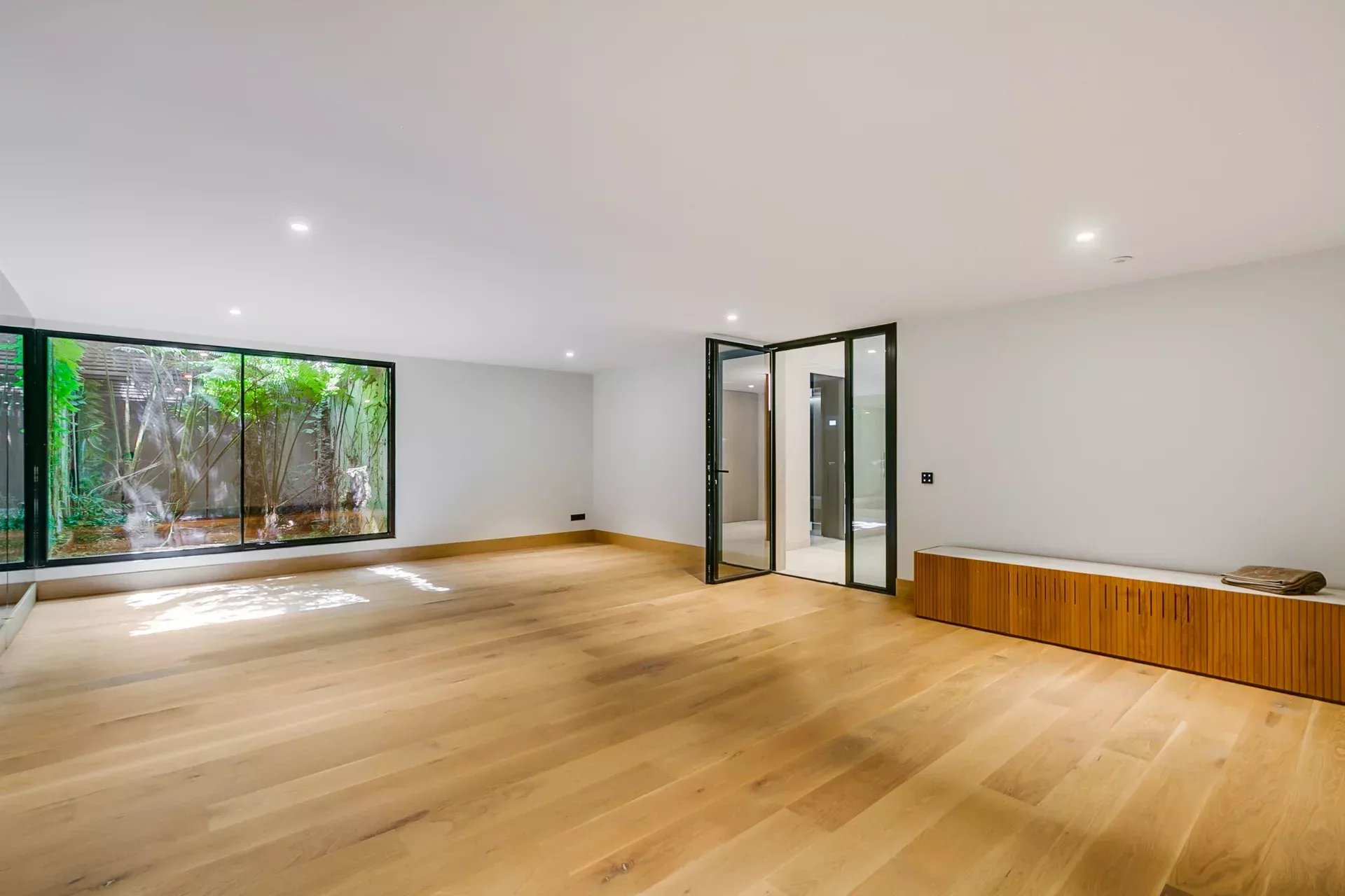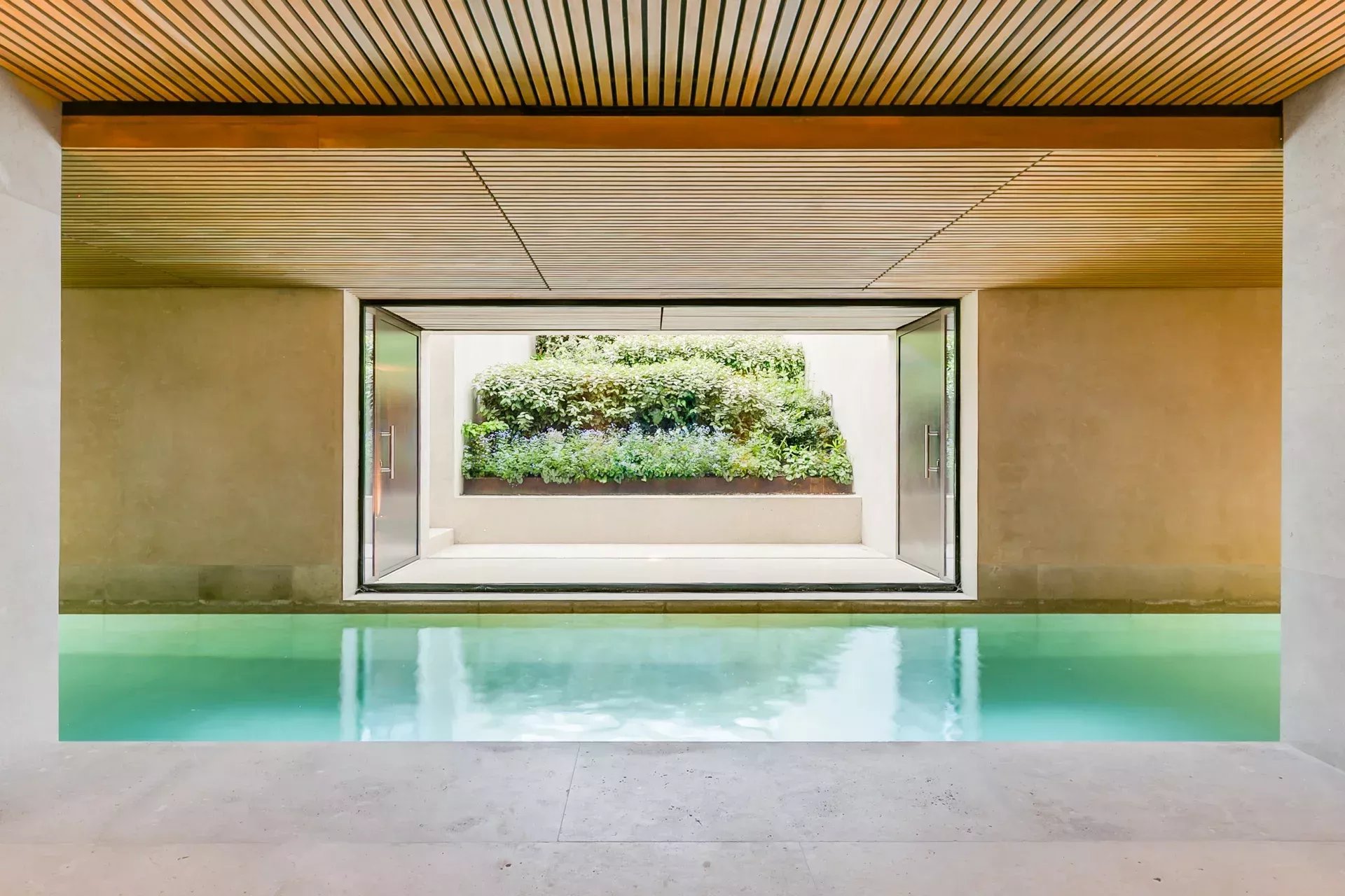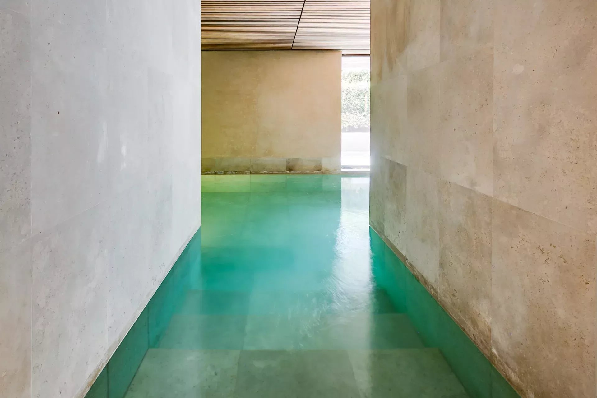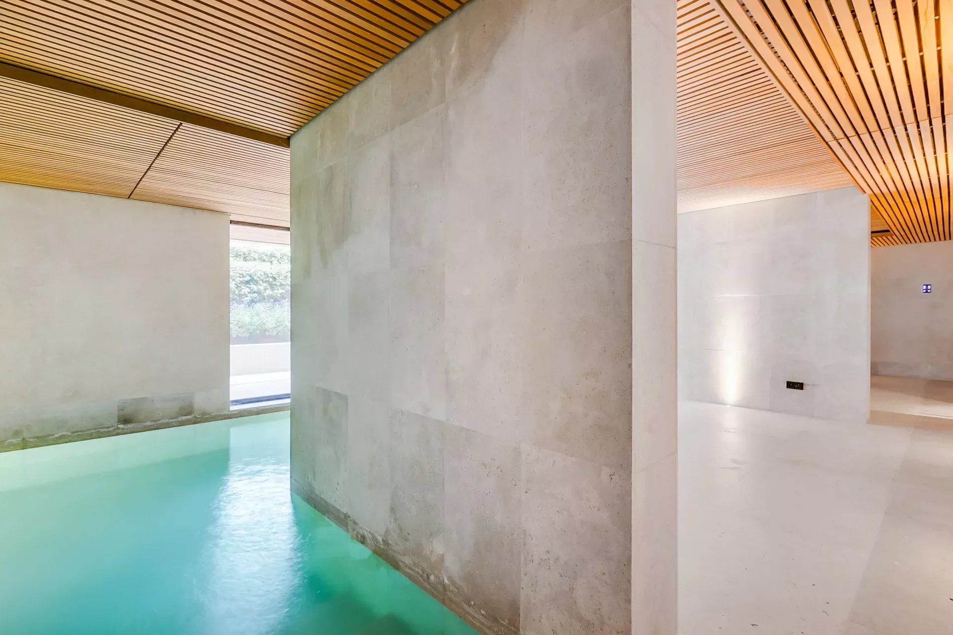 Le rez‑inférieur, avec accès direct au jardin et lumière naturelle grâce au dénivelé, abrite une impressionnante partie bien‑être comprenant piscine intérieure chauffée, sauna sec et humide, vestiaires, salles de bain et une salle polyvalente pour gym, yoga ou méditation.