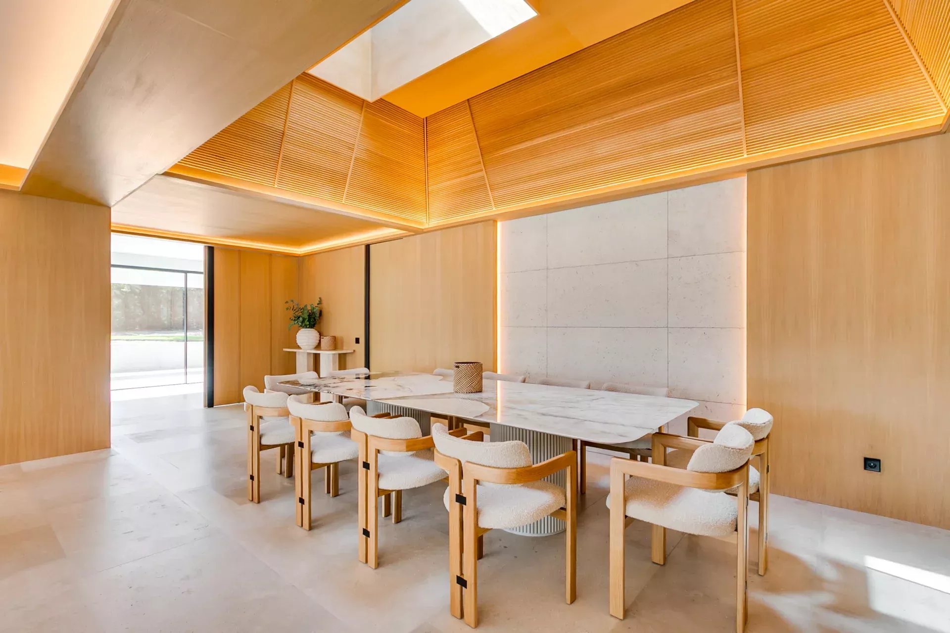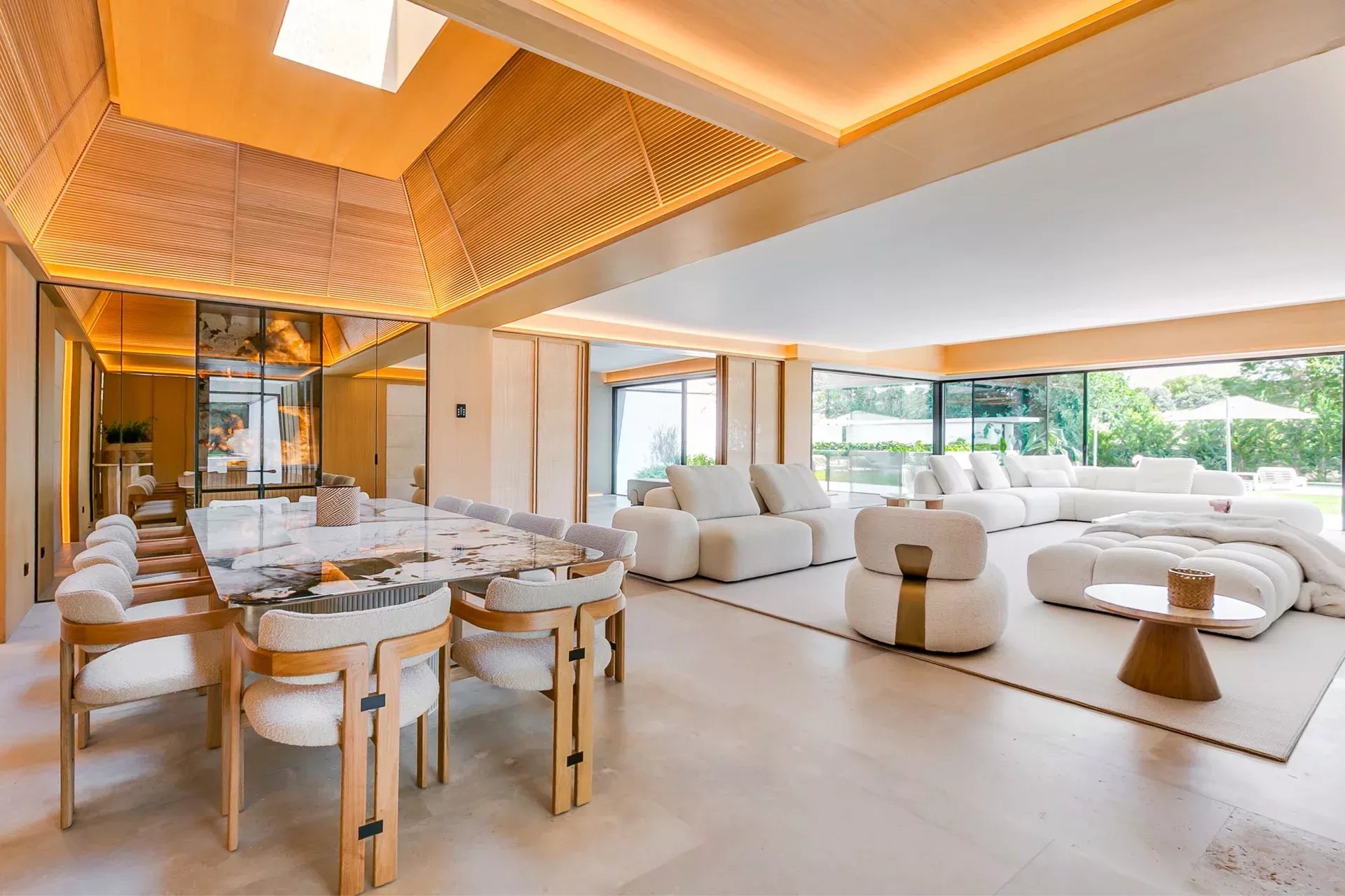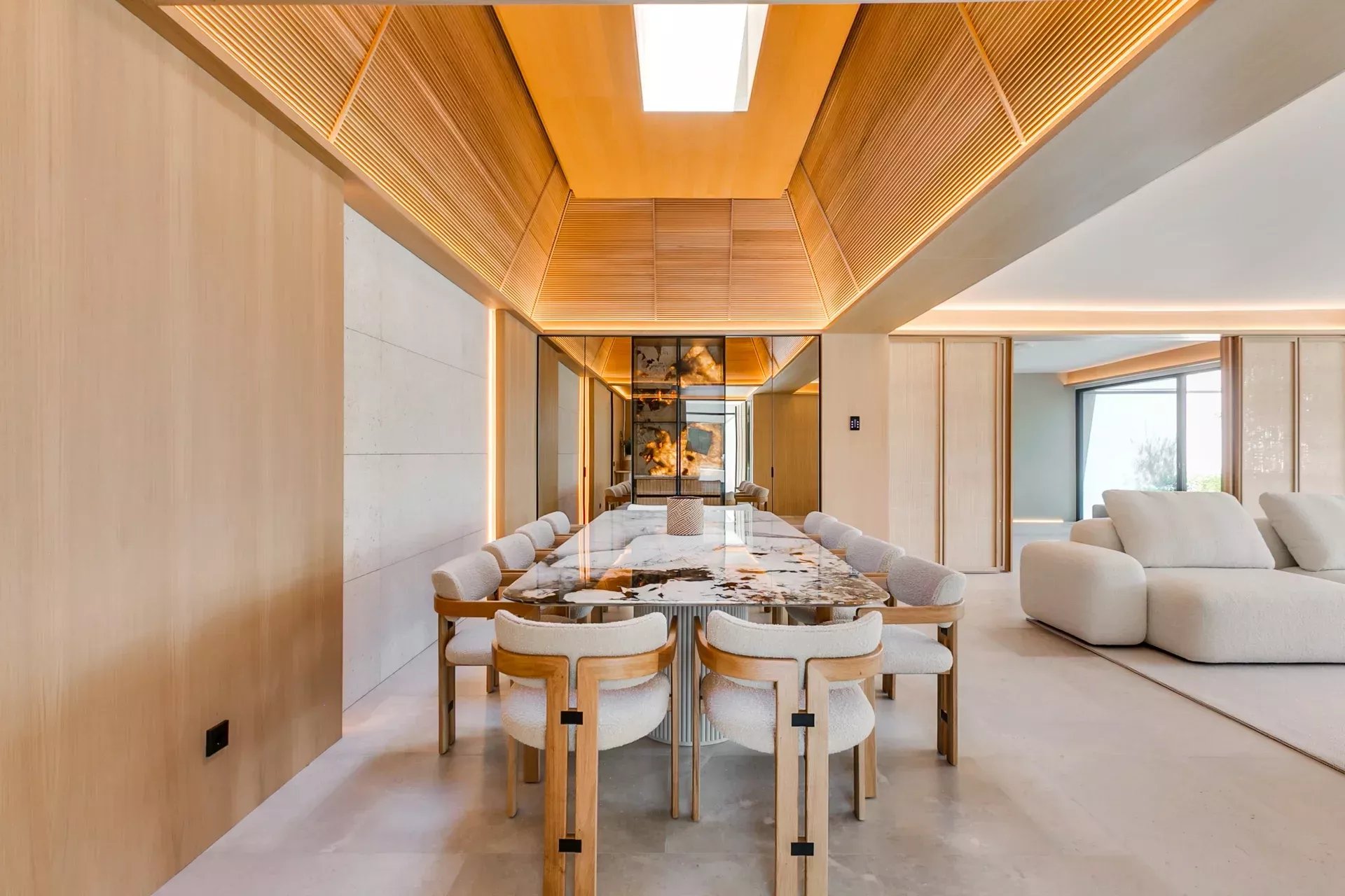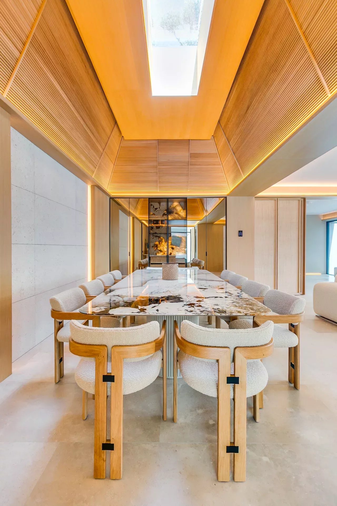 La salle à manger, avec son plafond en double hauteur en bois et sa table spectaculaire pour 12 convives, est sublimée par un panneau d’onyx rétroéclairé, véritable pièce sculpturale.