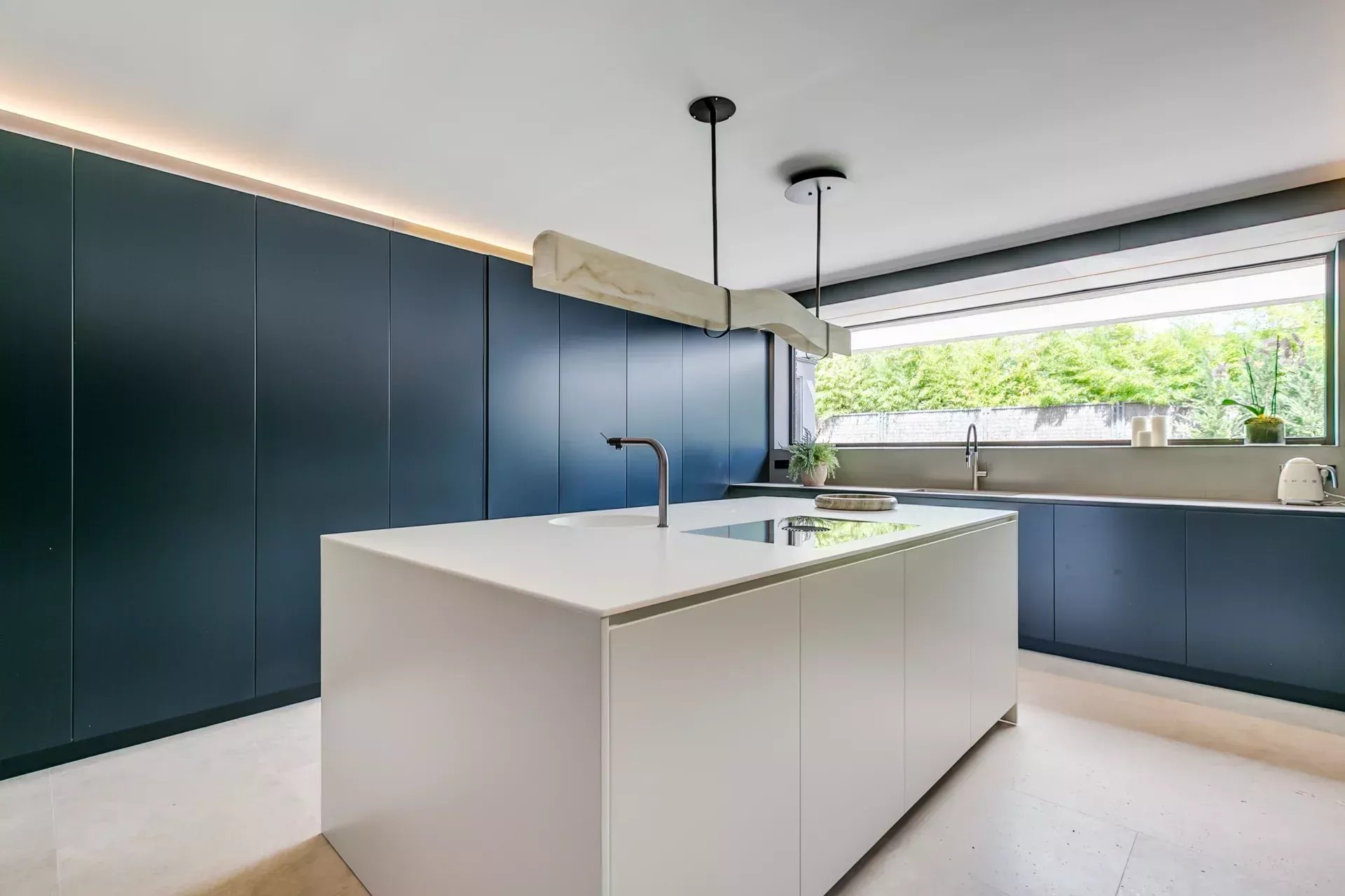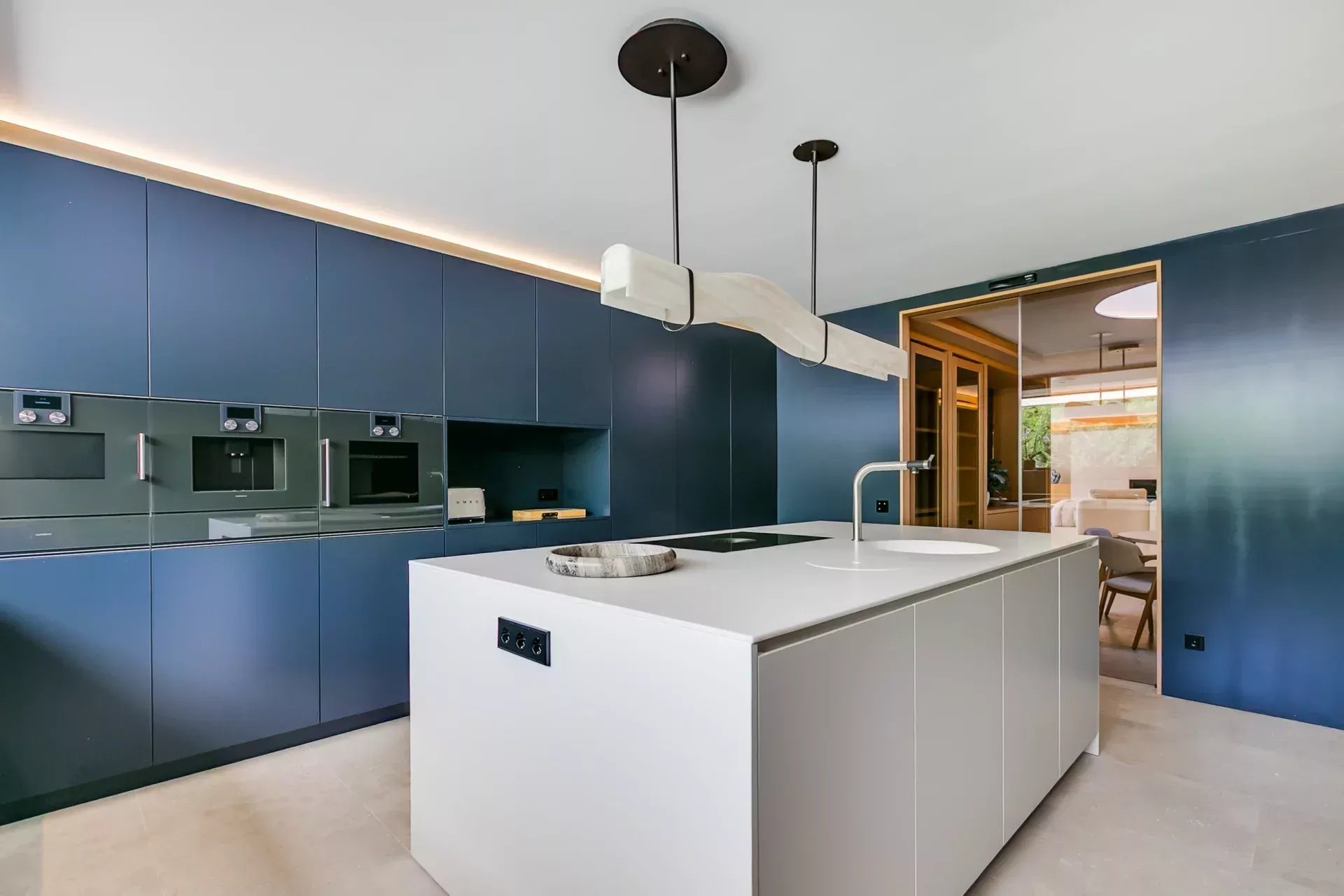 La cuisine principale, sobre et fonctionnelle, est équipée d’appareils de haute technologie, d’un îlot central, d’un monte‑plats et d’un coin petit‑déjeuner pour six personnes.