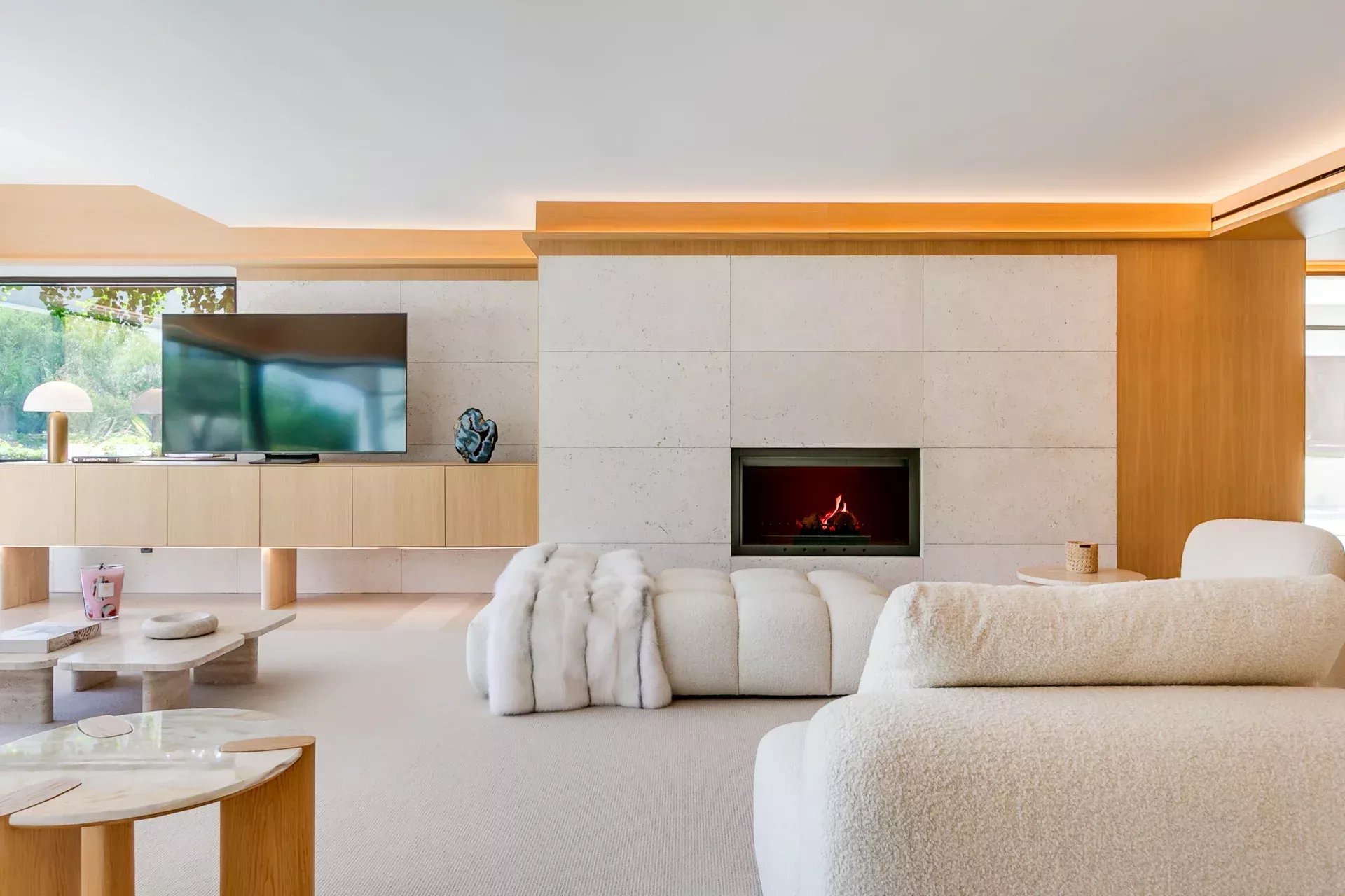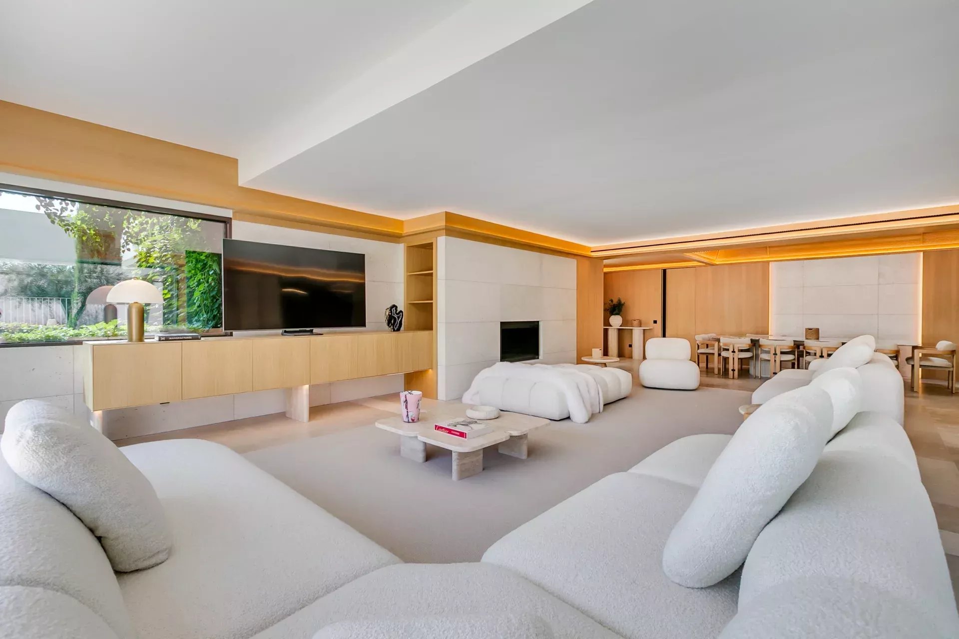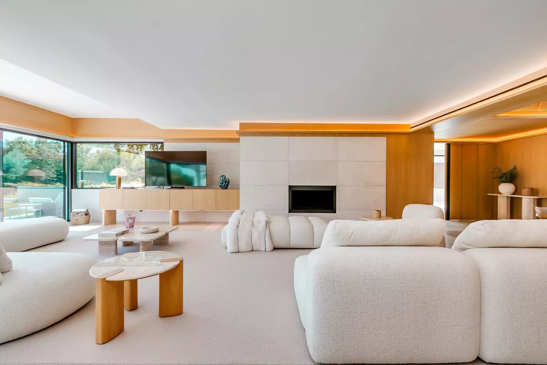 Le salon principal — spacieux, élégant et lumineux — s’ouvre sur le jardin par de grandes baies vitrées. La cheminée intégrée, le mobilier de designer et l’atmosphère sereine définissent ce lieu comme le cœur de la maison.