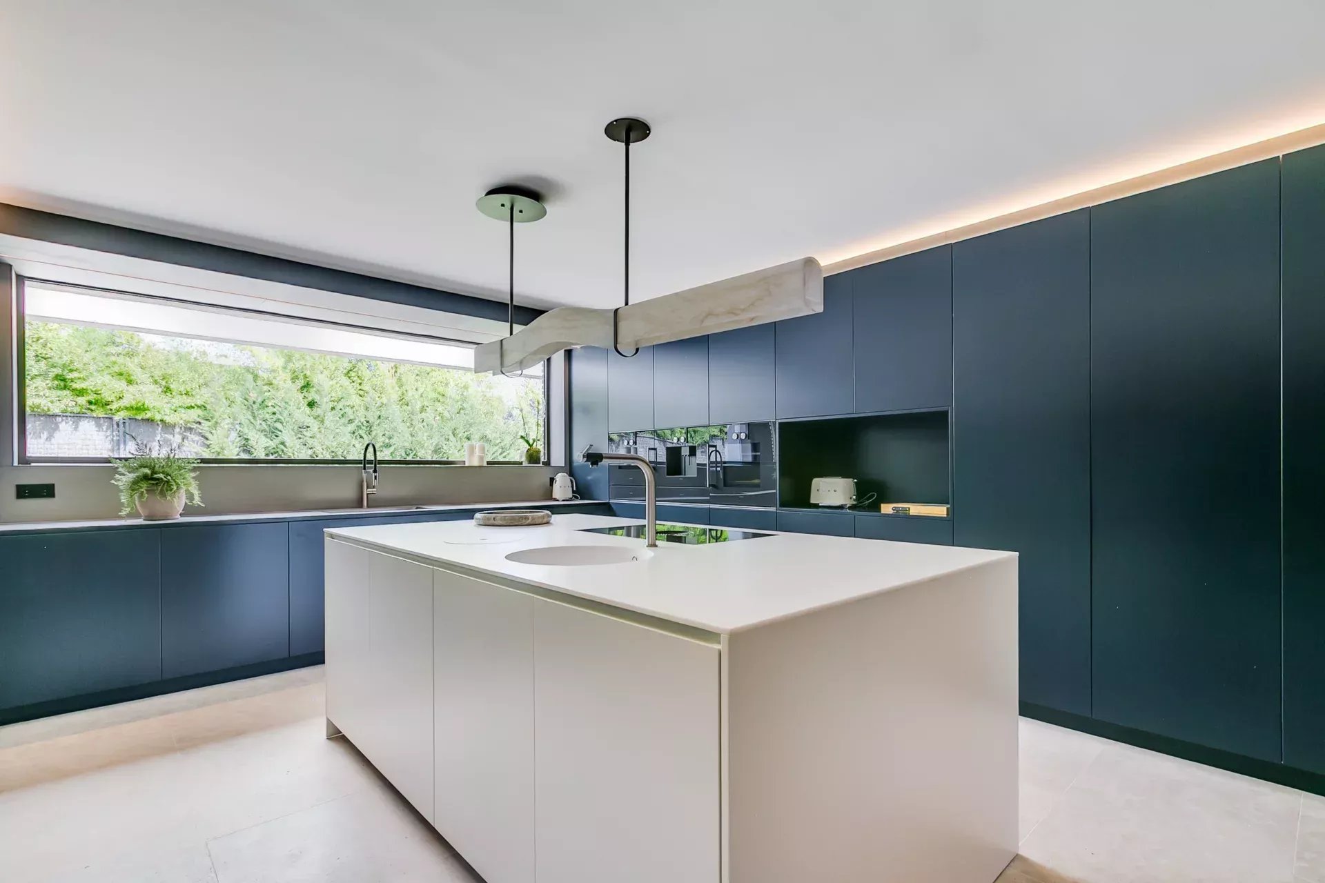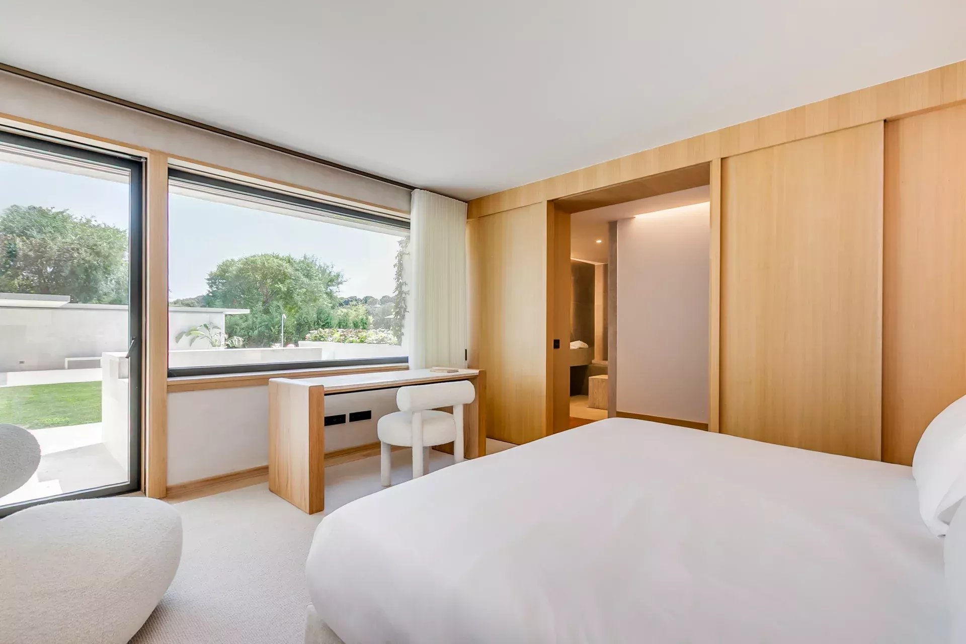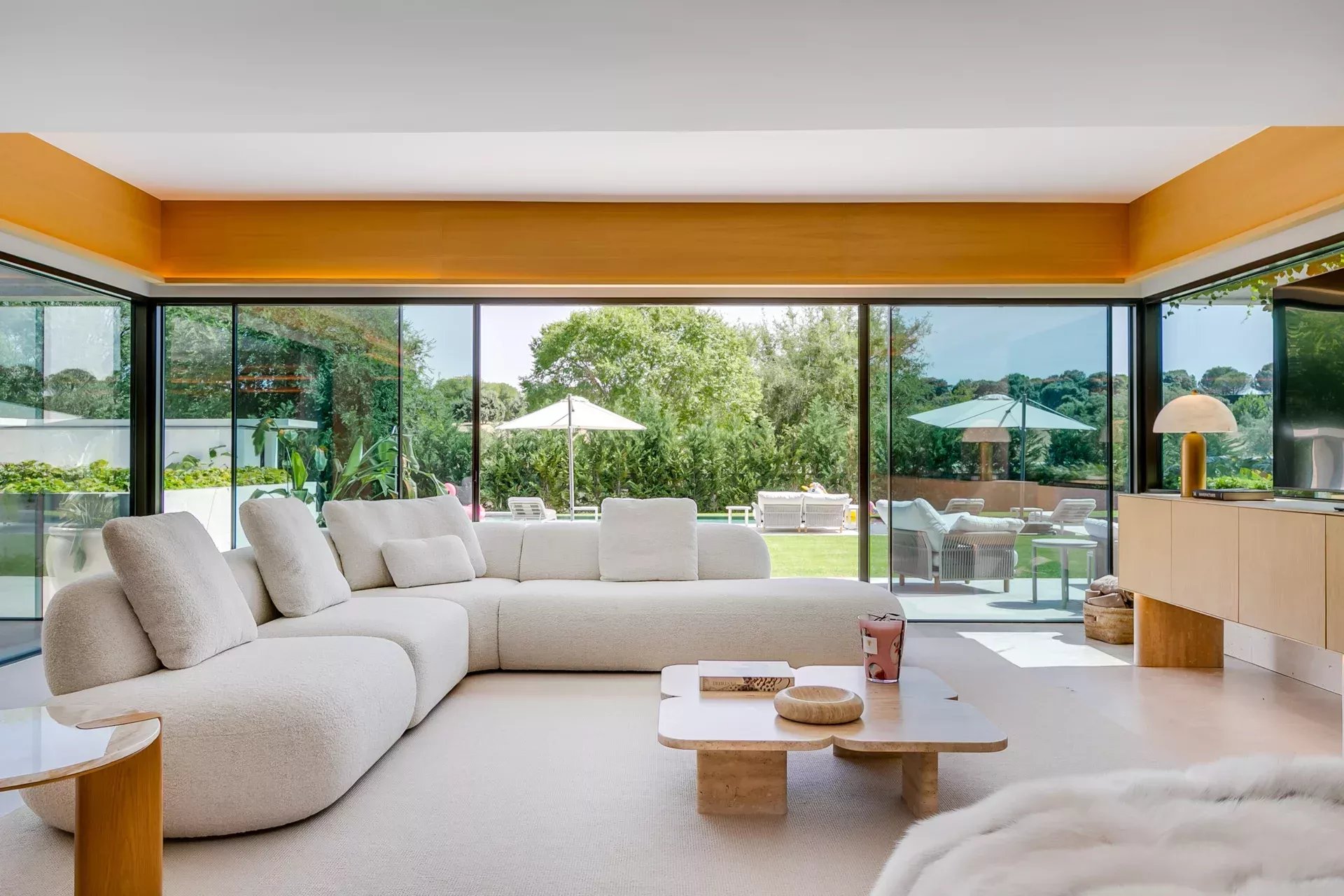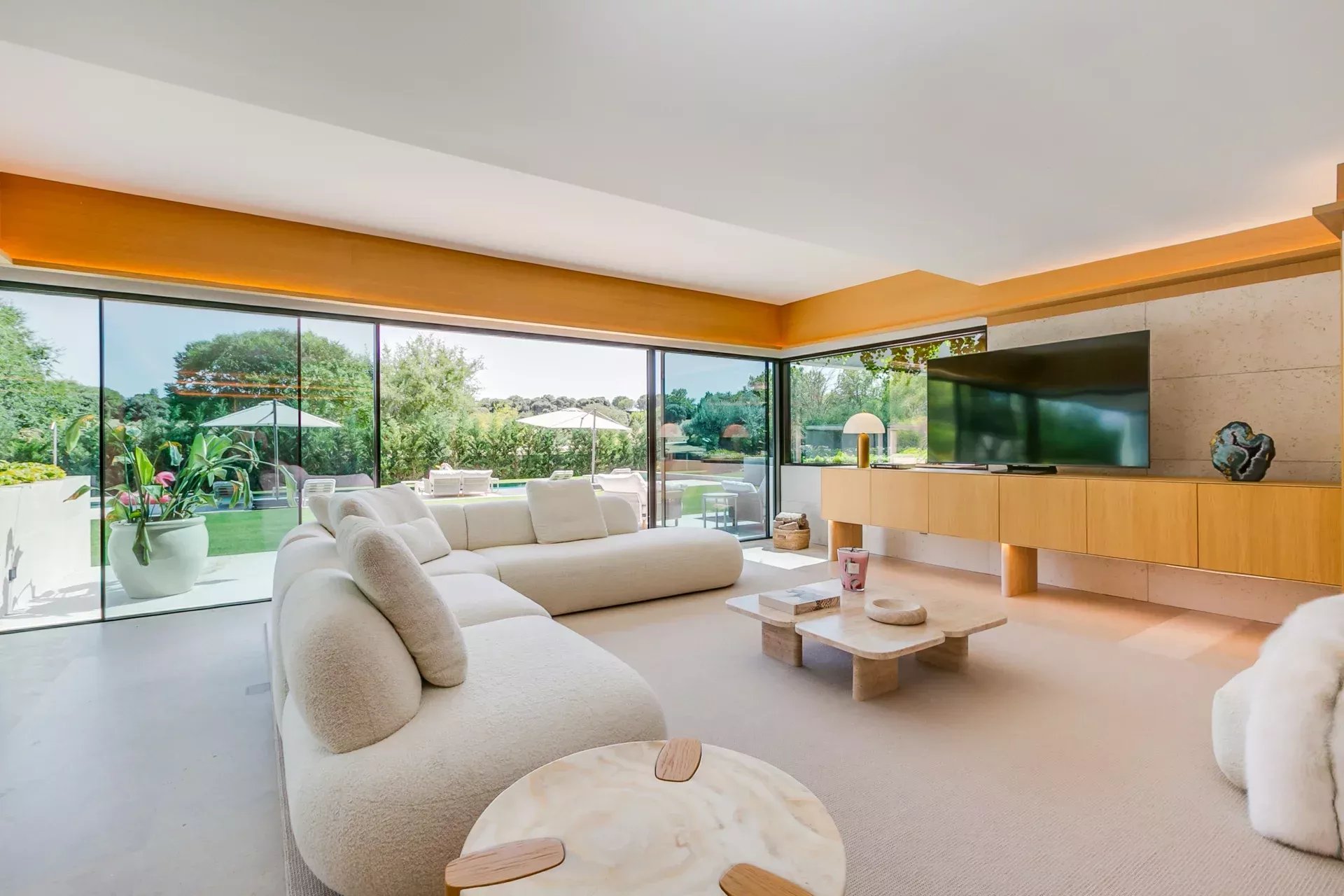 Le salon principal — spacieux, élégant et lumineux — s’ouvre sur le jardin par de grandes baies vitrées. La cheminée intégrée, le mobilier de designer et l’atmosphère sereine définissent ce lieu comme le cœur de la maison.