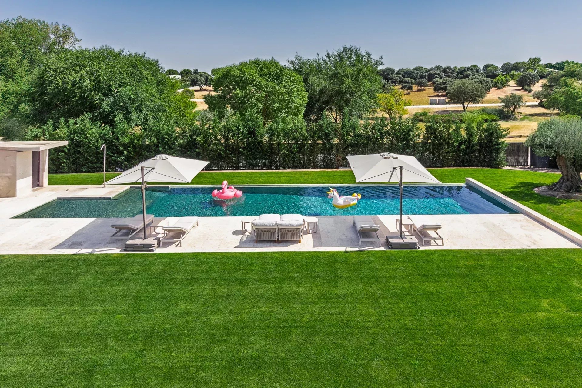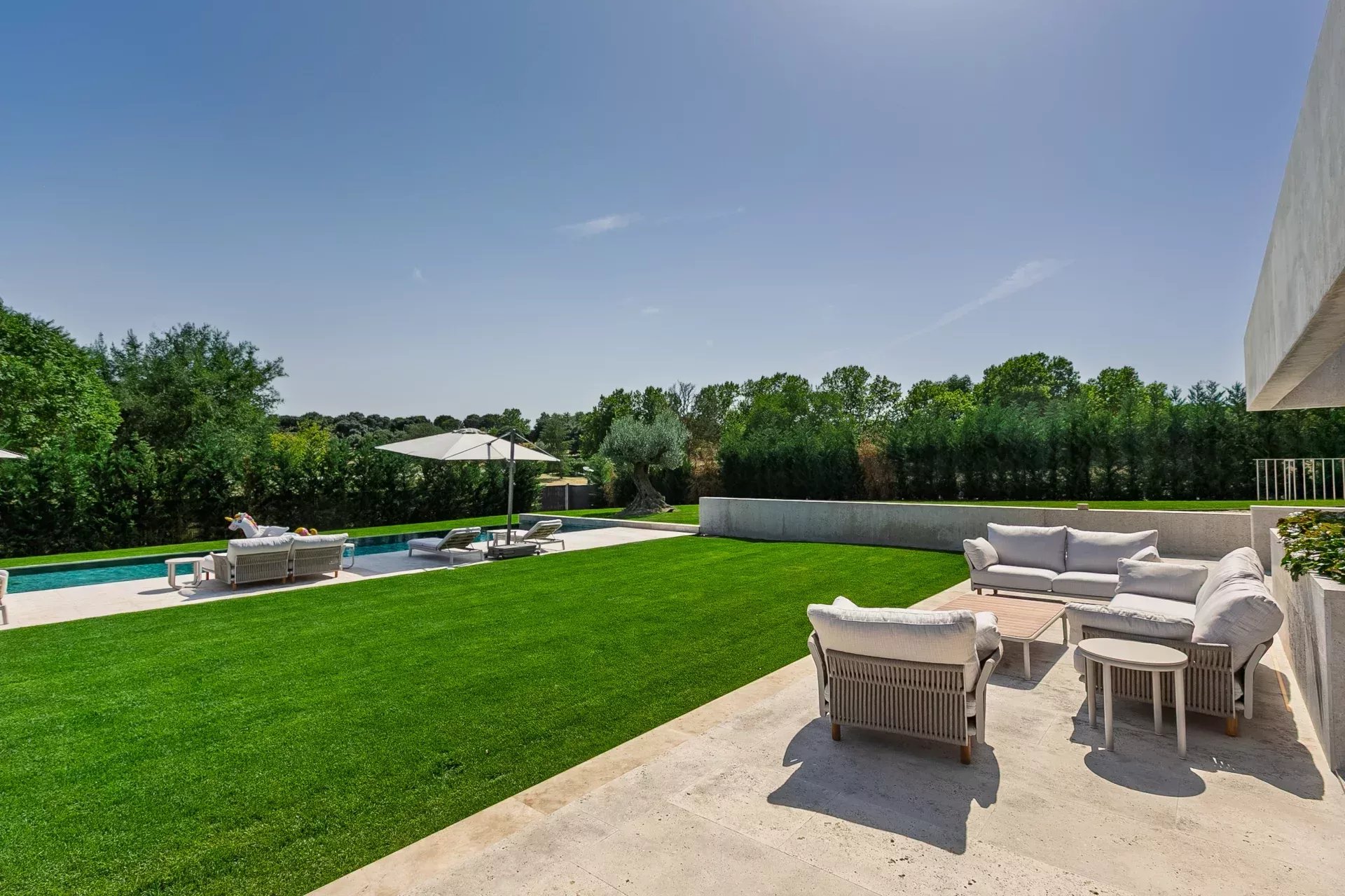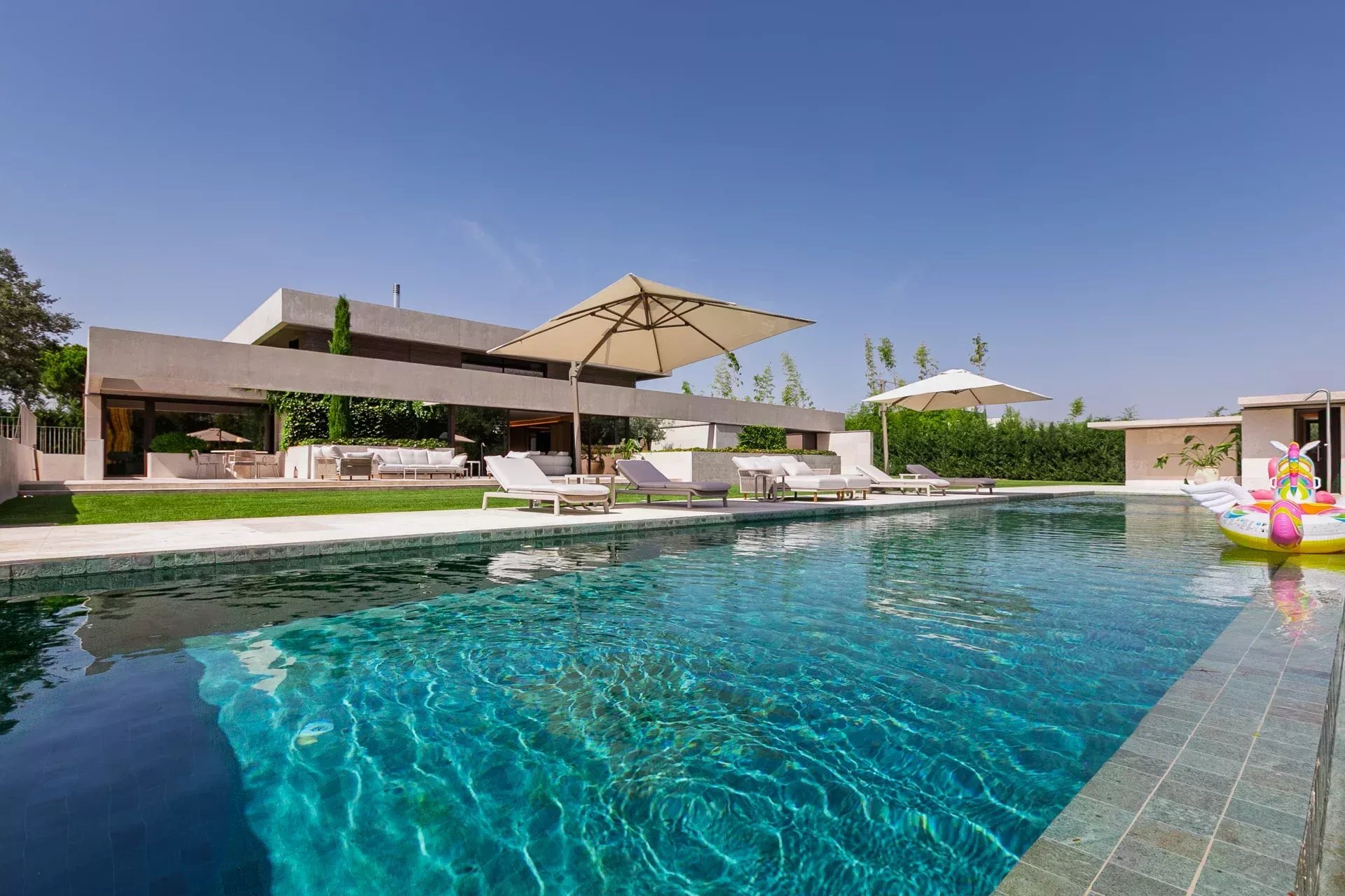 À l’extérieur, la propriété offre intimité totale, une piscine à débordement chauffée, des vestiaires, une salle de bain, des terrasses avec transats et parasols, le tout entouré d’un jardin soigneusement pensé avec végétation mature et vues ouvertes sur le golf.