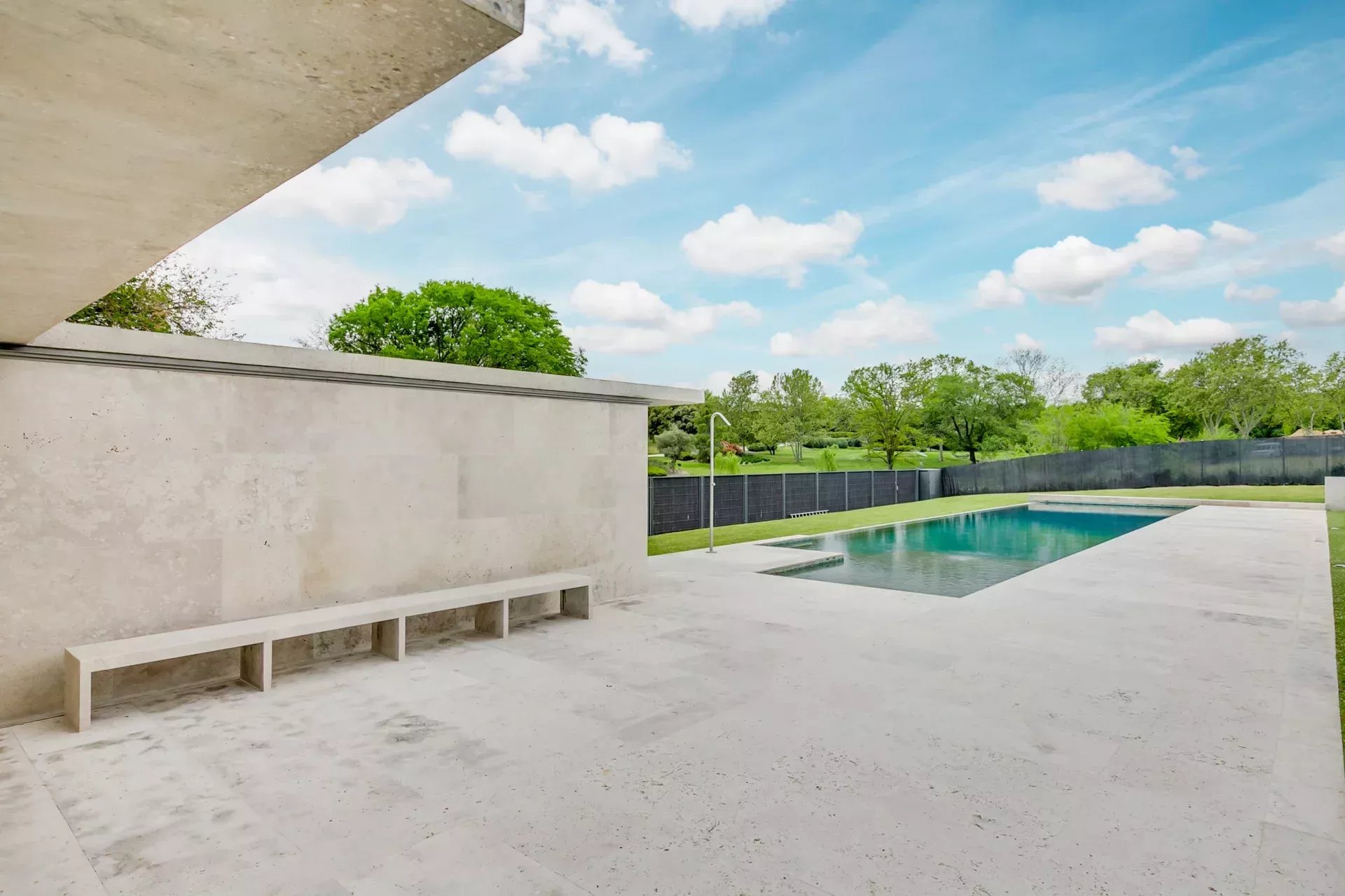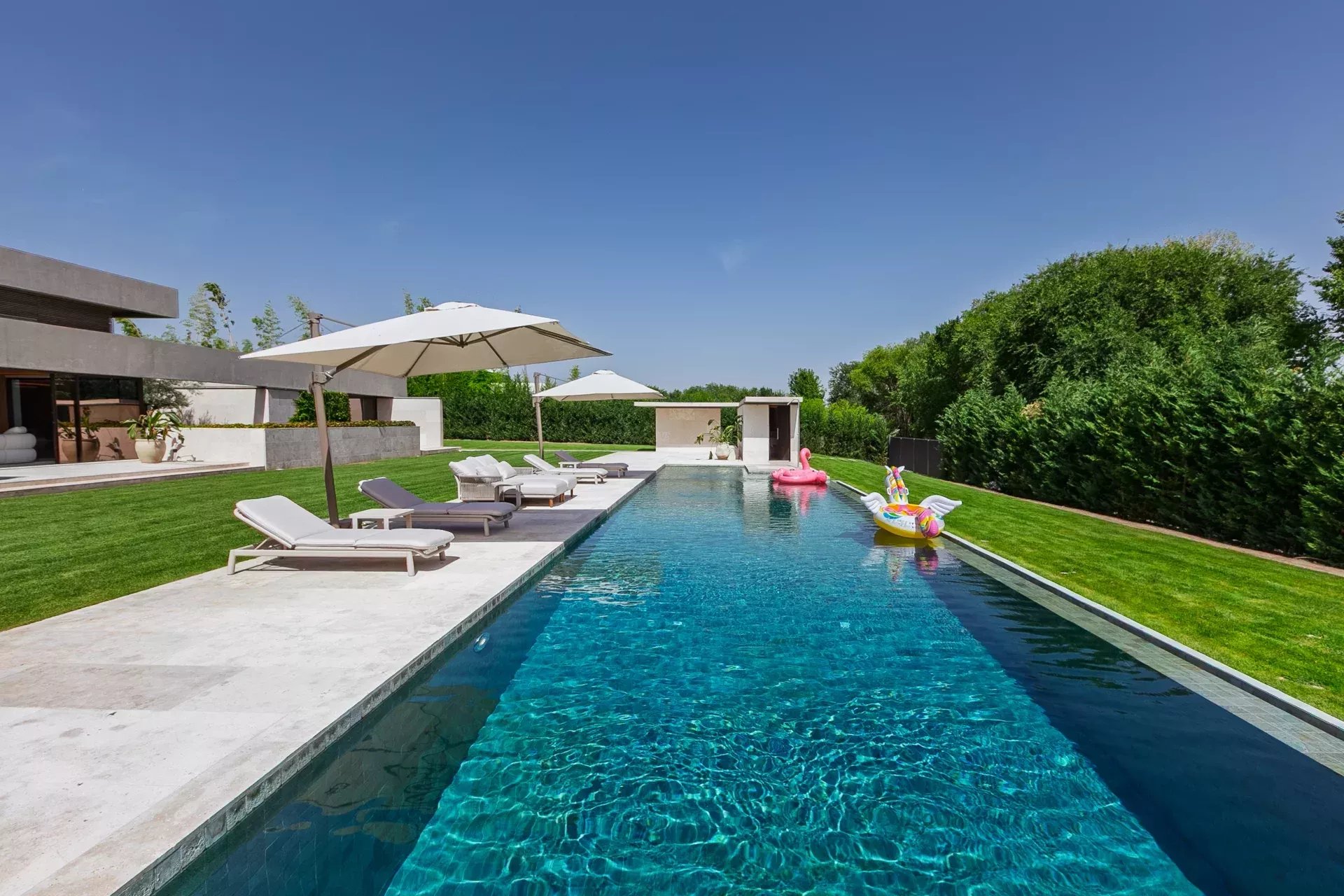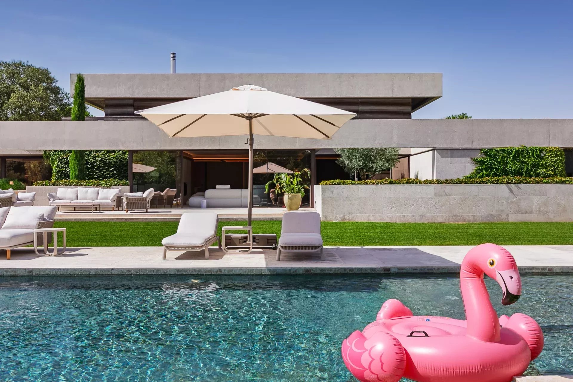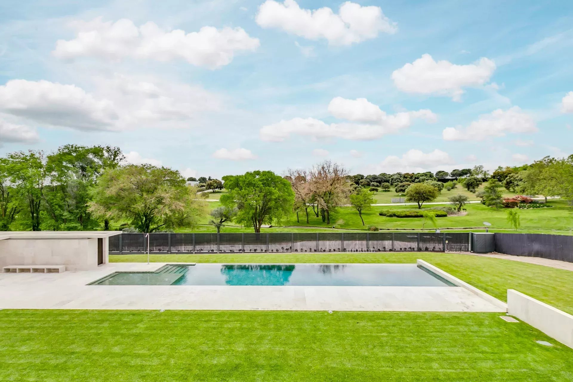 À l’extérieur, la propriété offre intimité totale, une piscine à débordement chauffée, des vestiaires, une salle de bain, des terrasses avec transats et parasols, le tout entouré d’un jardin soigneusement pensé avec végétation mature et vues ouvertes sur le golf.