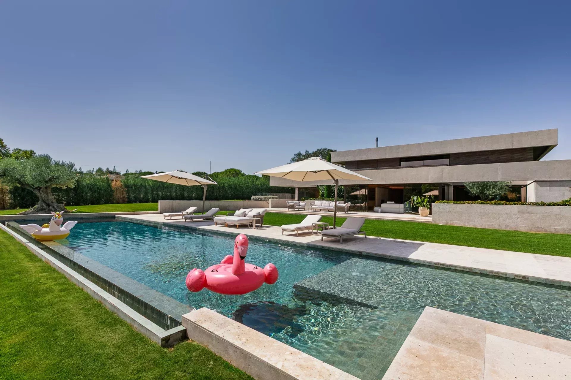 Une propriété unique par son architecture d’avant‑garde, son exécution irréprochable et son emplacement privilégié avec vues dégagées sur le golf et les lacs.