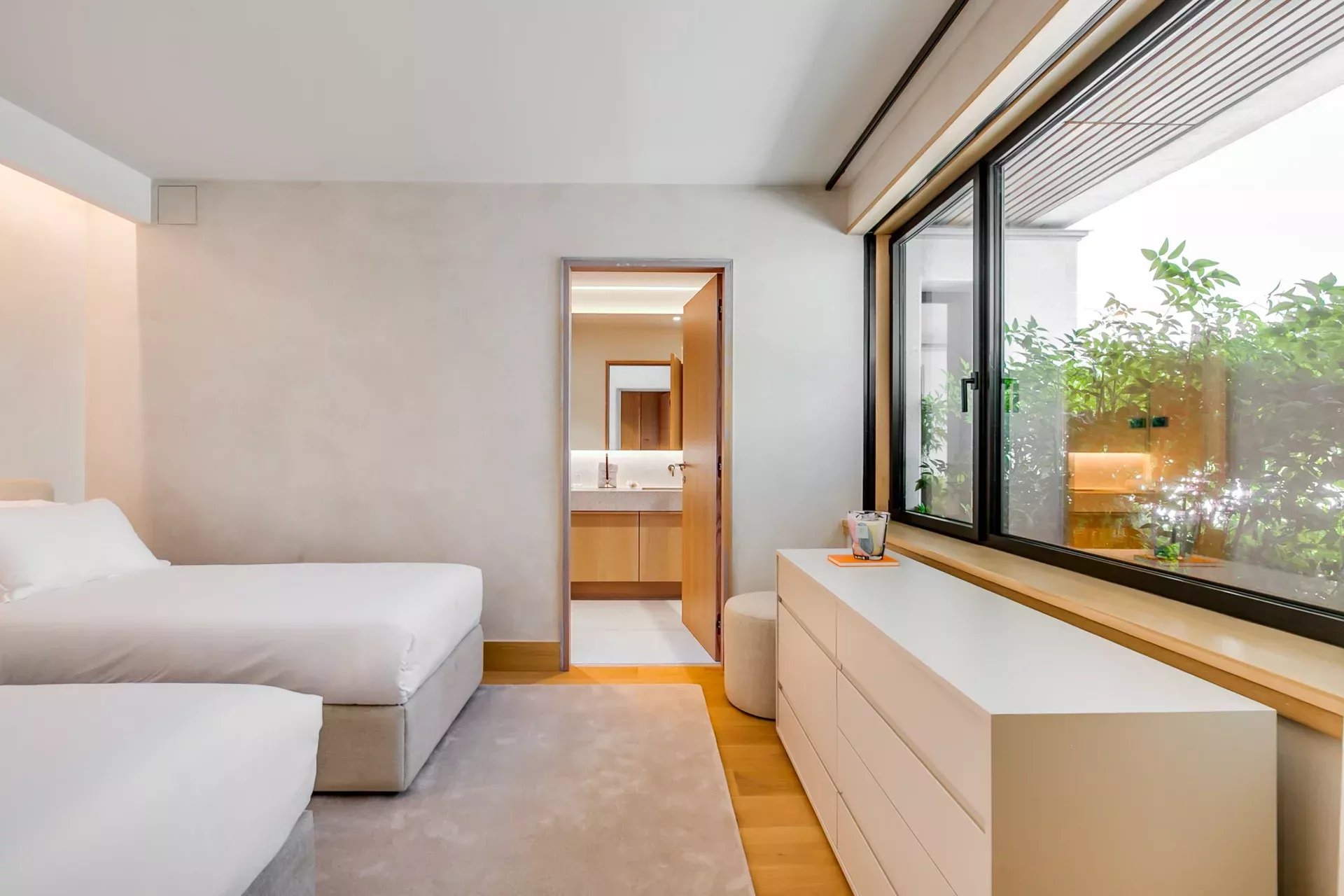 Au rez‑de‑chaussée (niveau d’entrée) se trouvent, en plus du salon, de la salle à manger et de la cuisine, trois chambres en suite : deux avec lit double et une avec deux lits simples, toutes équipées de placards intégrés et finitions en chêne naturel. À ce niveau se trouve également une pièce vitrée modulable, idéale en bureau ou salon.